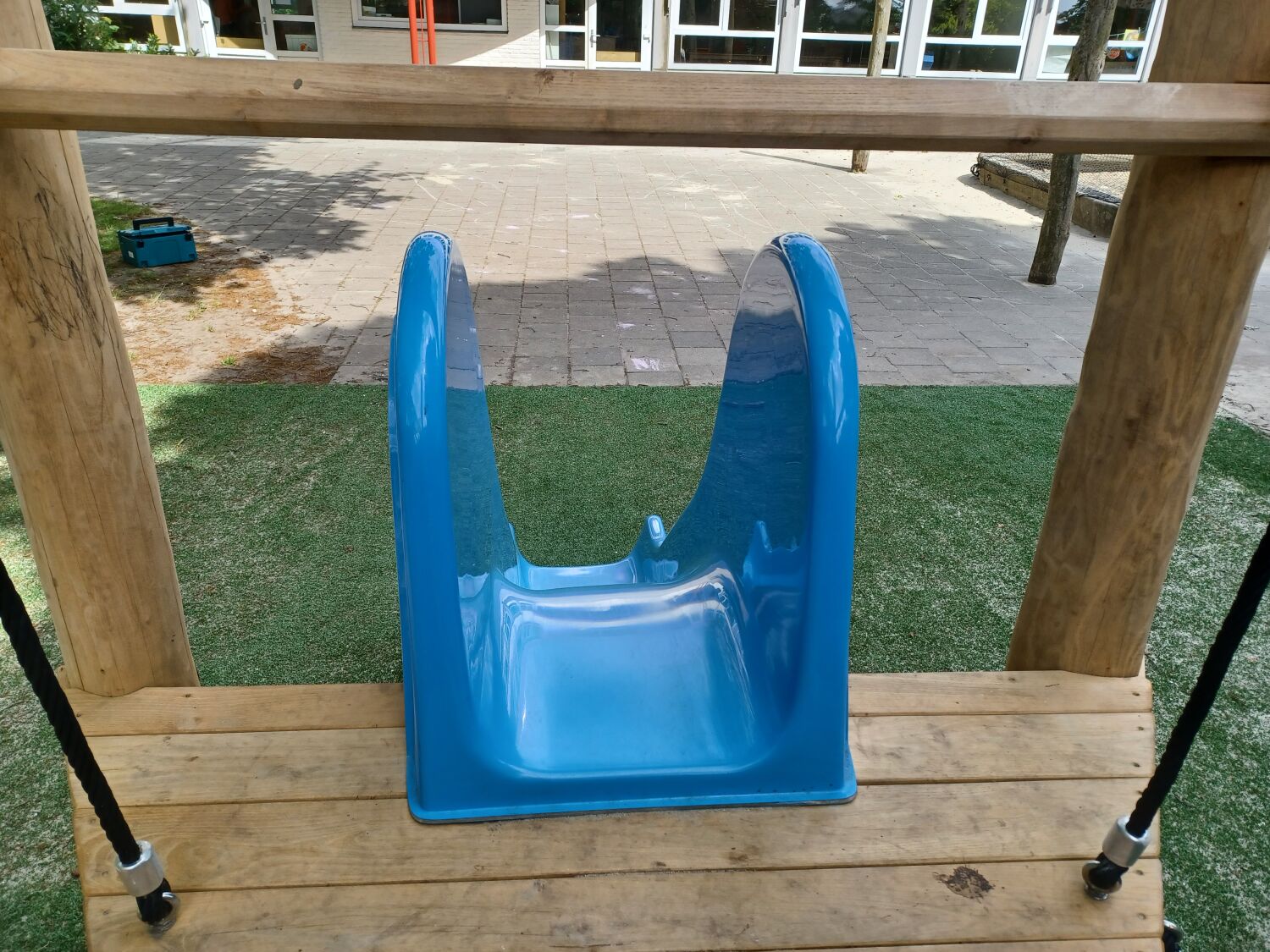 De keuze is uiteindelijk gevallen op Glijbaantoren Jasmijn blauw. Deze glijbaantoren is gemaakt van Robinia hout met een kunststof glijbaan in een felblauwe kleur. Deze blauwe kleur is gekozen om het kleurrijke van het vorige speeltoestel naar voren te brengen. De toren is te bereiken via kruipplateaus en hierdoor zeer geschikt voor een jongere doelgroep.