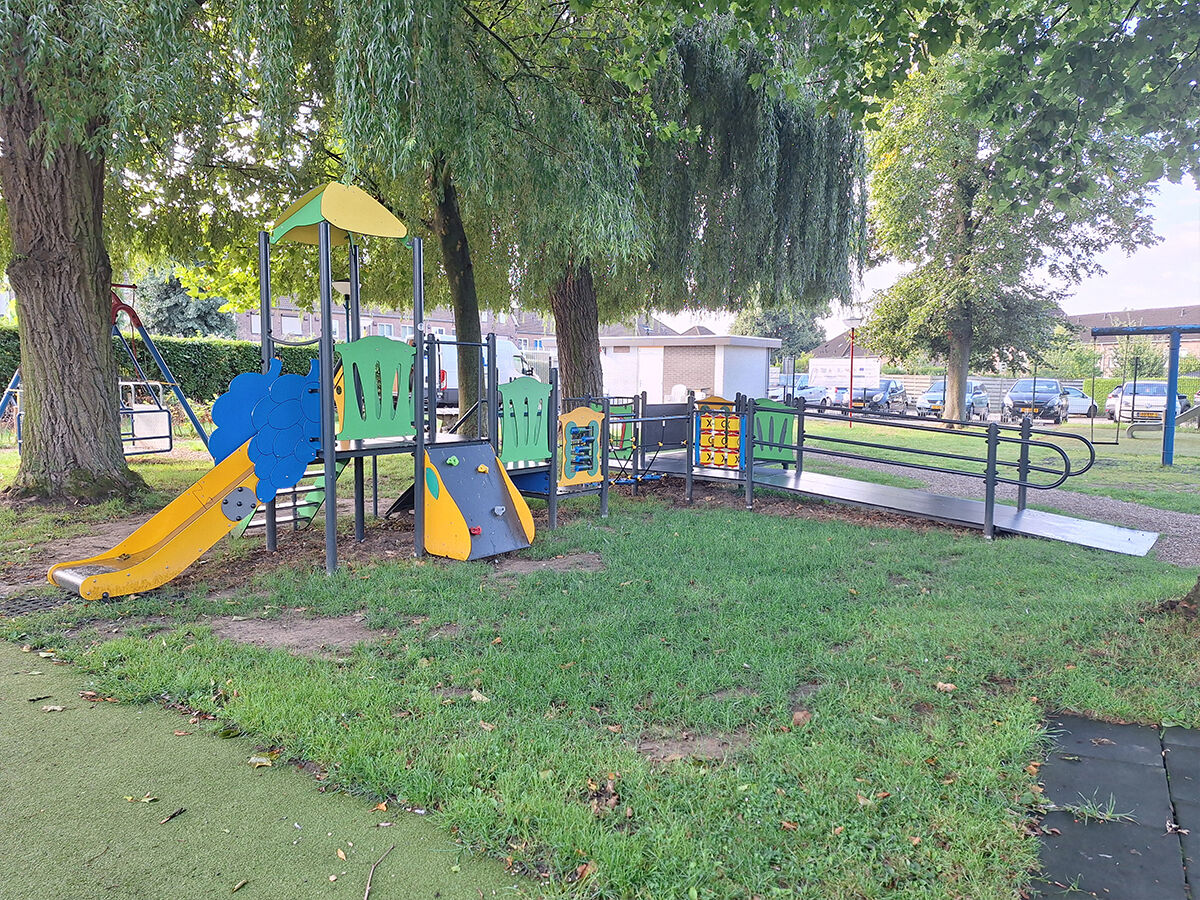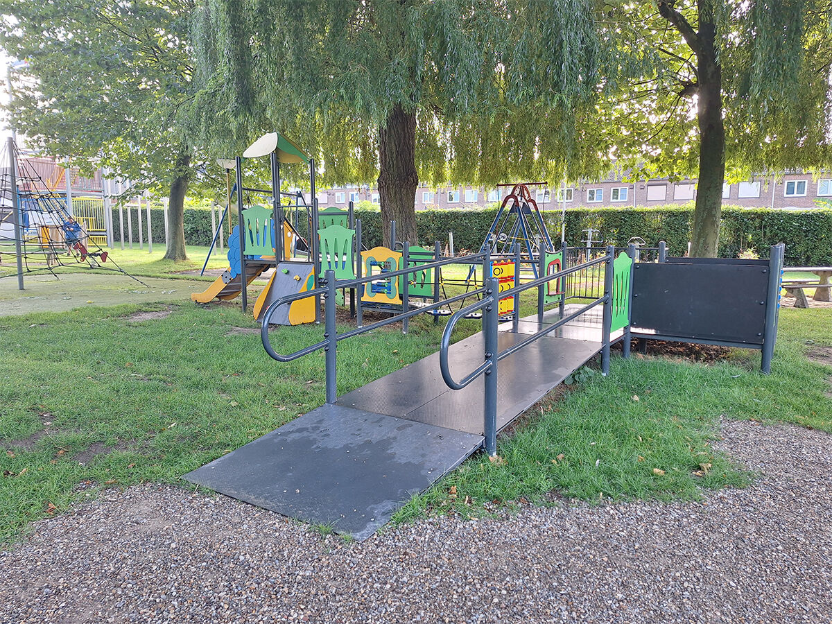 Op de speelplek is een groot toestel geplaatst met een rolstoelpad. Zo kunnen kinderen die in een rolstoel zitten over het toestel rijden en samen met hun vriendjes spelen. Ook de Carrousel Bries maakt dit mogelijk: kinderen kunnen erin rijden en samen ronddraaien, wat plezier en inclusie met zich meebrengt. Daarnaast is er een voelwand toegevoegd met vlakken van verschillende materialen en structuren, zodat kinderen spelenderwijs kunnen ontdekken en raden wat ze voelen. Twee extra veertoestellen maken de speelervaring compleet en geven jongere kinderen extra speelplezier.