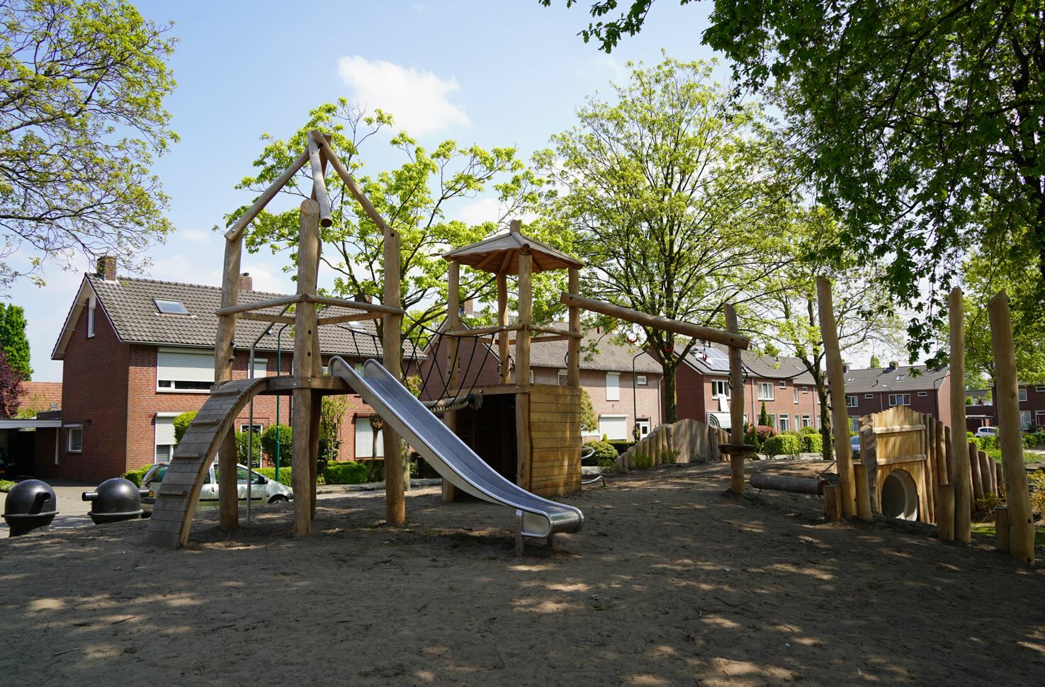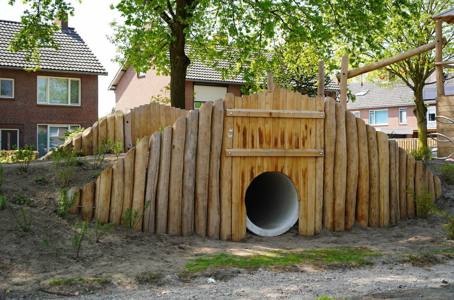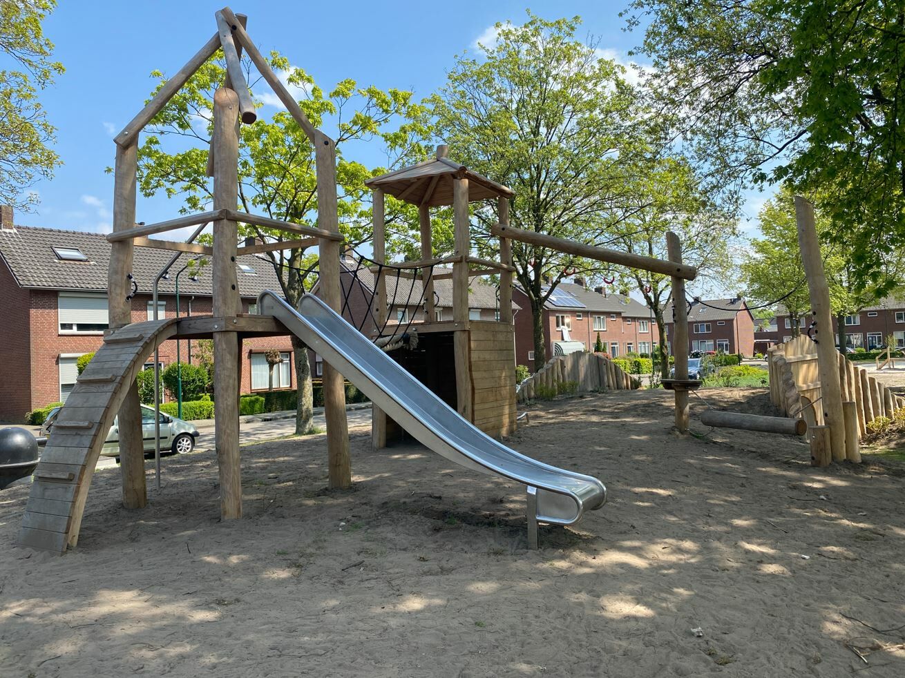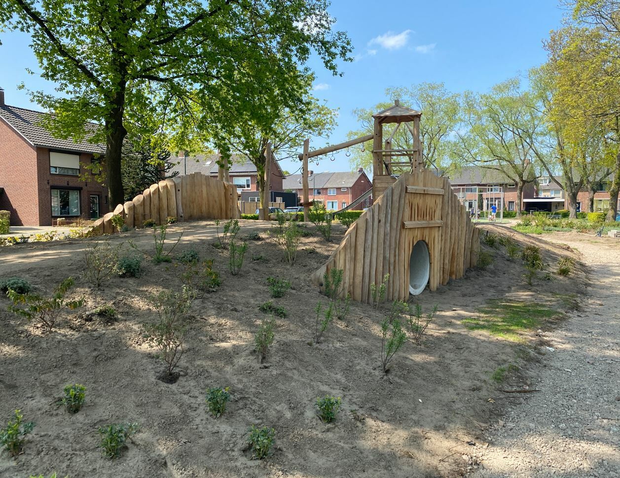 Er is een combinatie van verschillende speeltoestellen gemaakt van Robinia hout gekomen. Een combinatie van toestellen die aantrekkelijk zijn voor jong en oud. De reden dat er voor Robinia hout is gekozen komt omdat deze natuurlijke uitstraling het beste past bij de buurt.