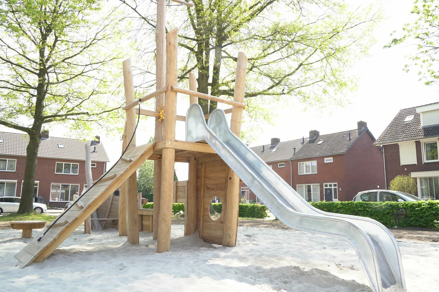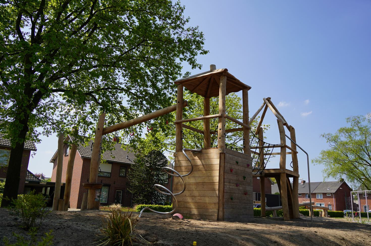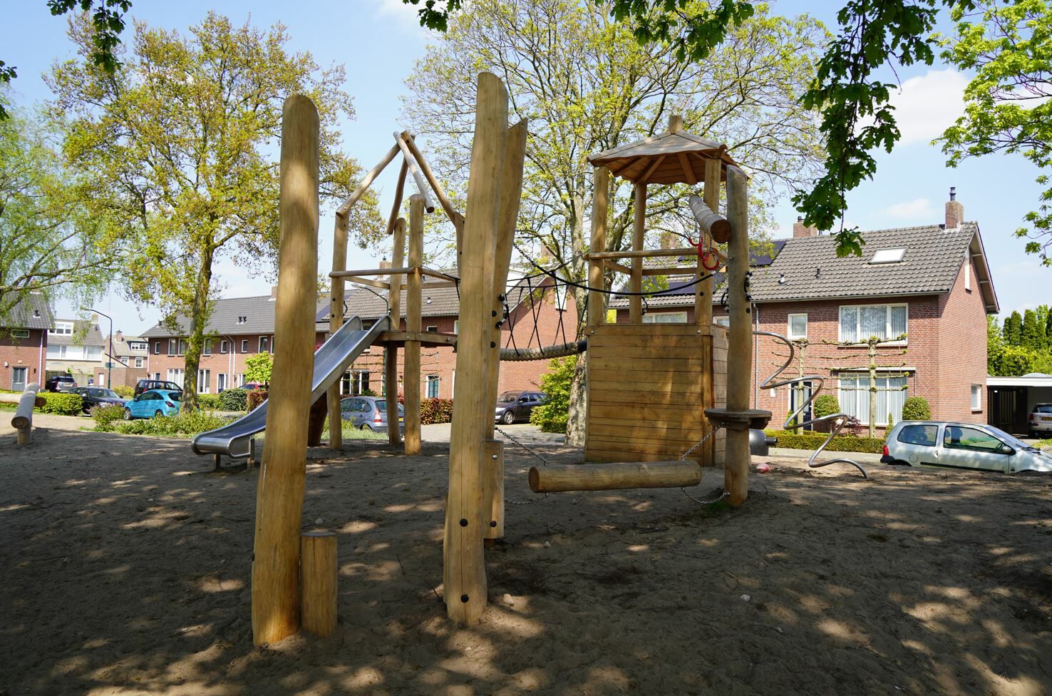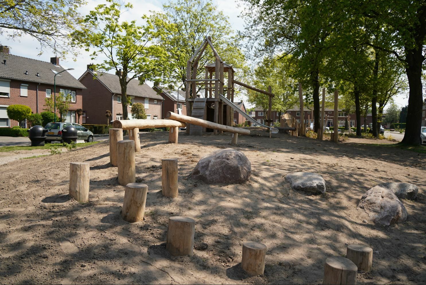 Er is een combinatie van verschillende speeltoestellen gemaakt van Robinia hout gekomen. Een combinatie van toestellen die aantrekkelijk zijn voor jong en oud. De reden dat er voor Robinia hout is gekozen komt omdat deze natuurlijke uitstraling het beste past bij de buurt.