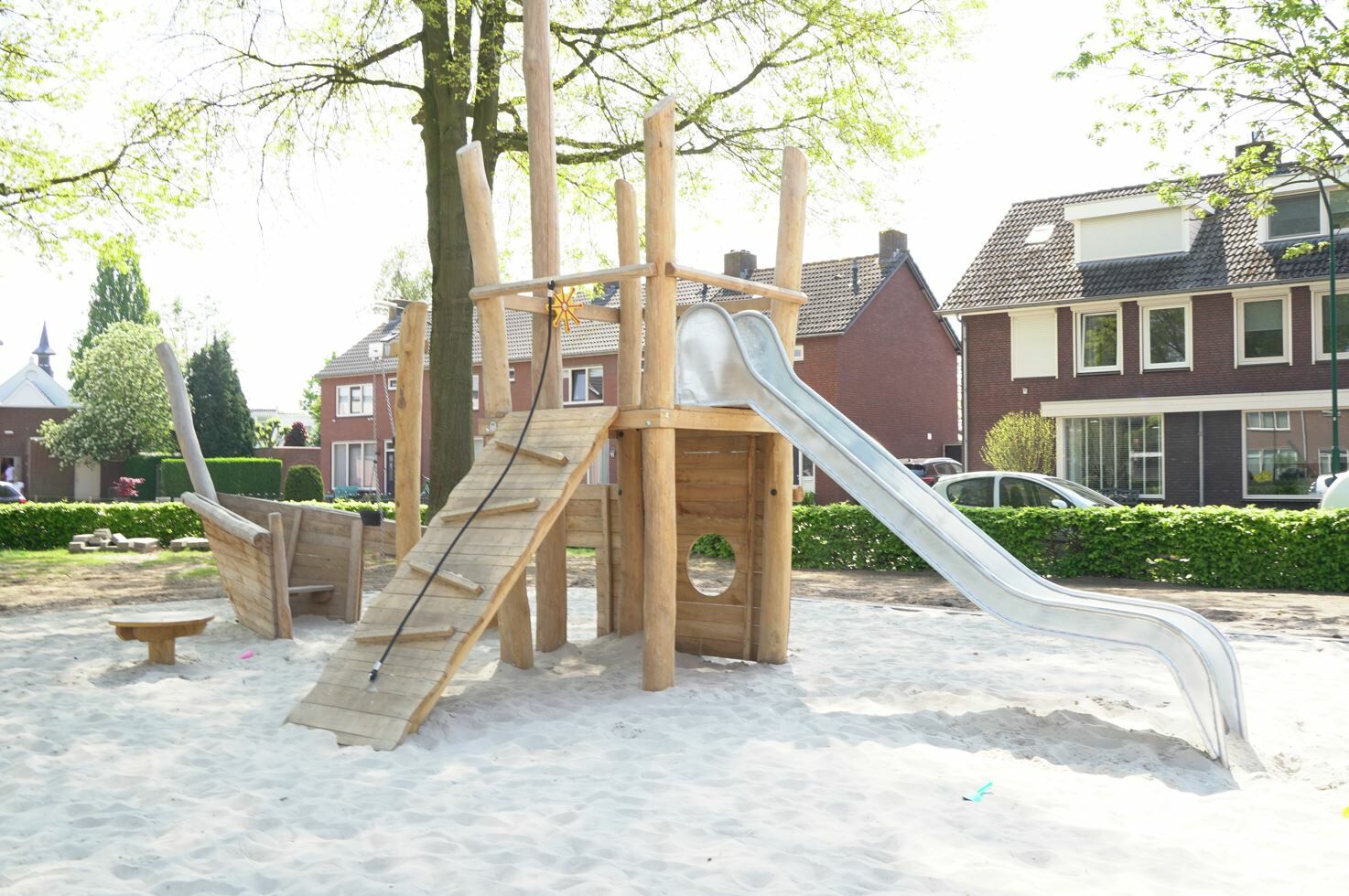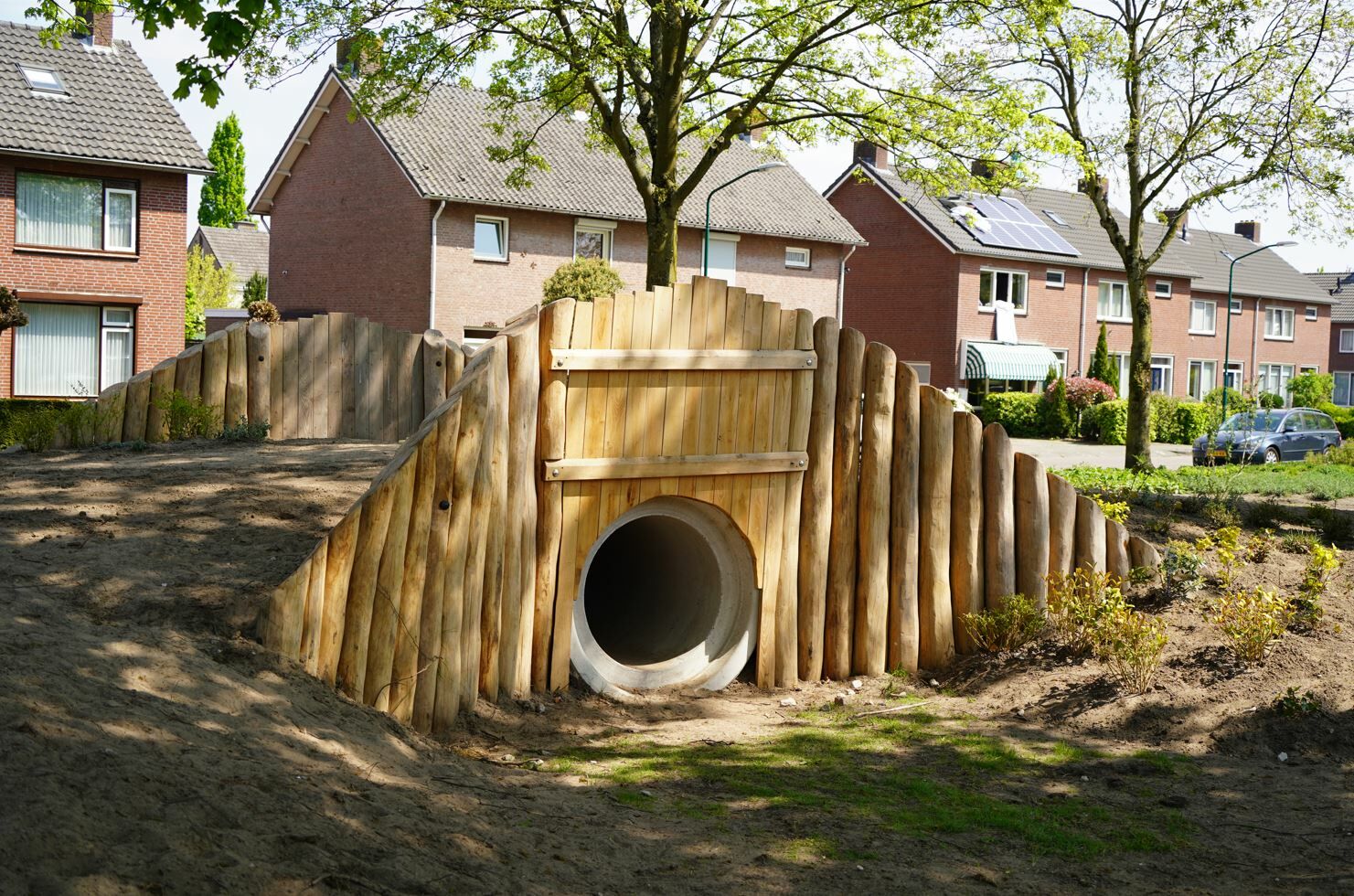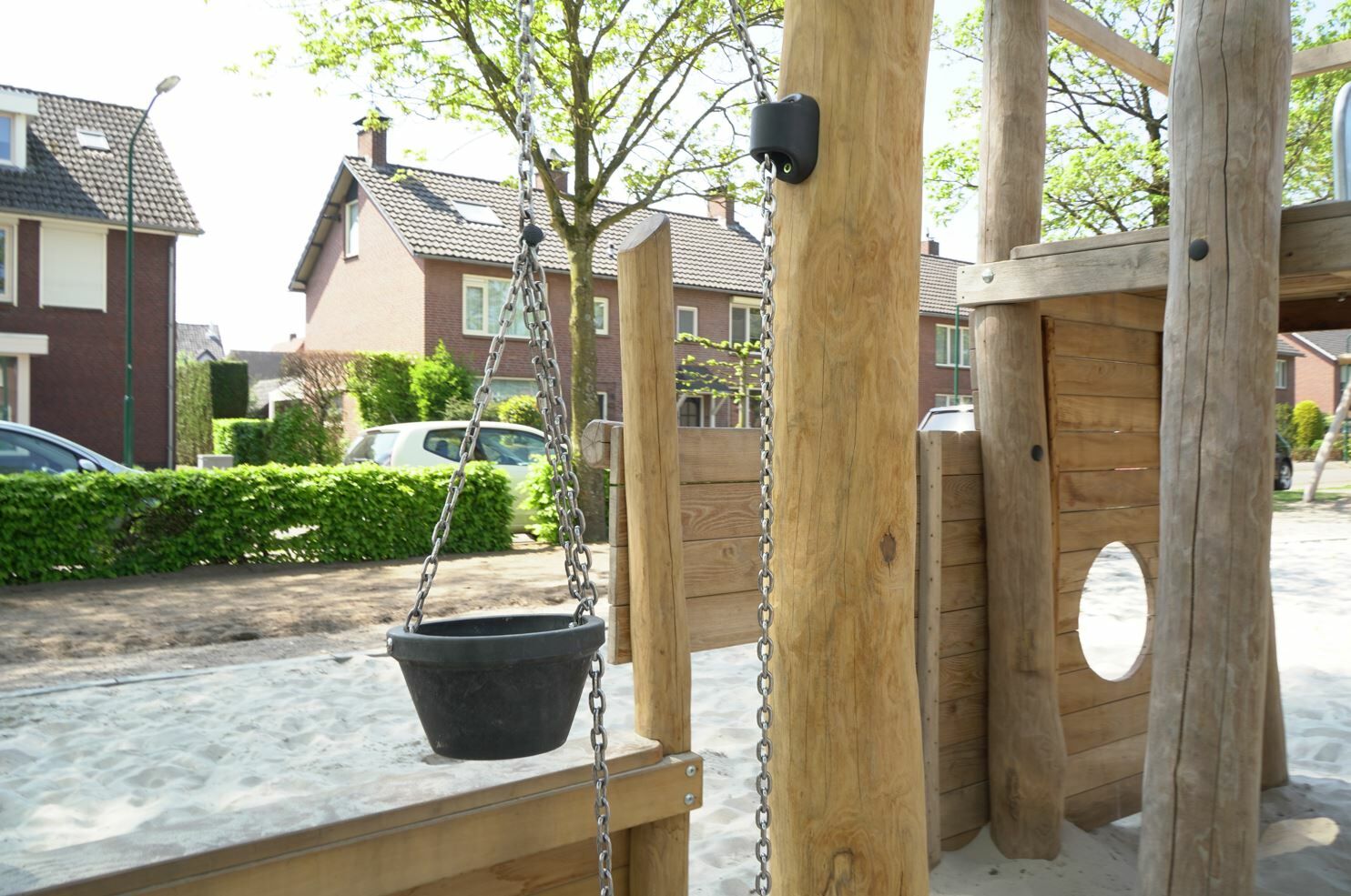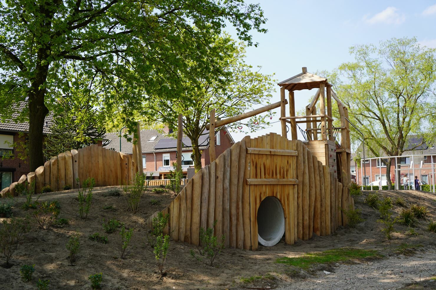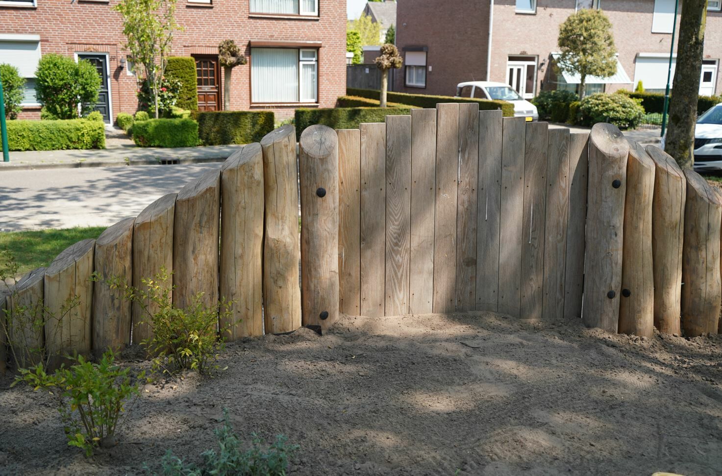 Er is een combinatie van verschillende speeltoestellen gemaakt van Robinia hout gekomen. Een combinatie van toestellen die aantrekkelijk zijn voor jong en oud. De reden dat er voor Robinia hout is gekozen komt omdat deze natuurlijke uitstraling het beste past bij de buurt.