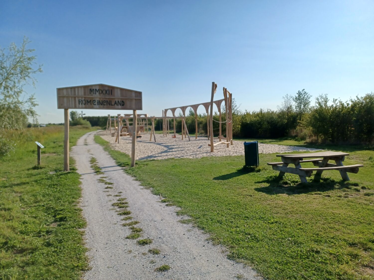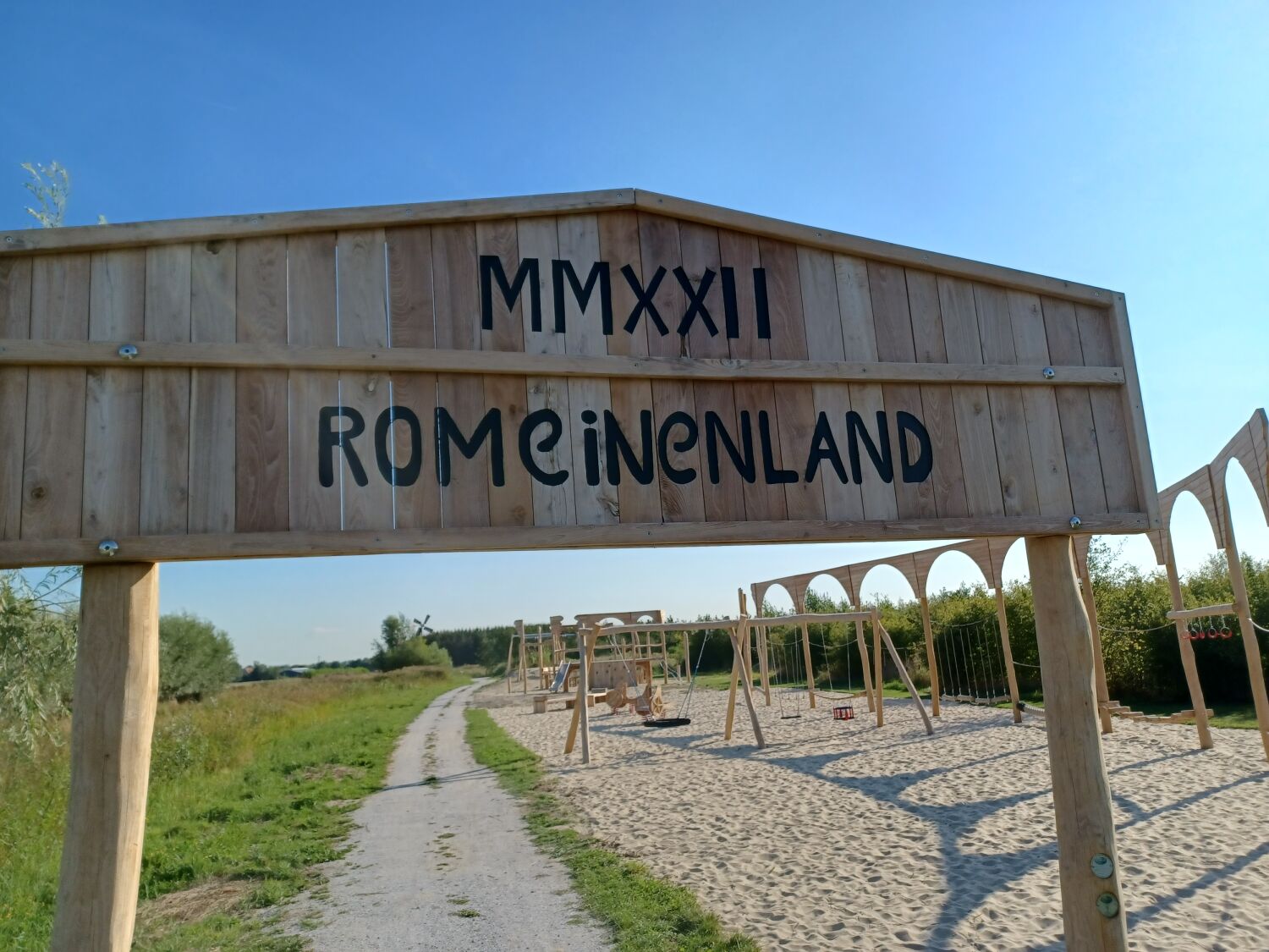 En zo is Romeinenland geboren: een grote buitenspeeltuin die geheel in het teken staat van de tijd van de Romeinen. De speeltoestellen die geplaatst zijn laten elementen zien die bij deze tijd horen. Je betreedt de speeltuin via een Romeinse toegangspoort. Wat je direct zal opvallen zijn het Romeins podium, een amfitheater en een Romeinse strijdwagen. Kinderen kunnen tegen elkaar racen op de dubbele kabelbaan of door een potje touw te trekken. Ook is er nog een combinatieschommel en romeins parcours aanwezig. Van al dat strijden en spelen kan er daarna uitgerust worden op de Romeinse sofa’s. Ook fijn voor ouders die hun kinderen willen aanmoedigen terwijl deze in de rol duiken van echte Romeinen!
