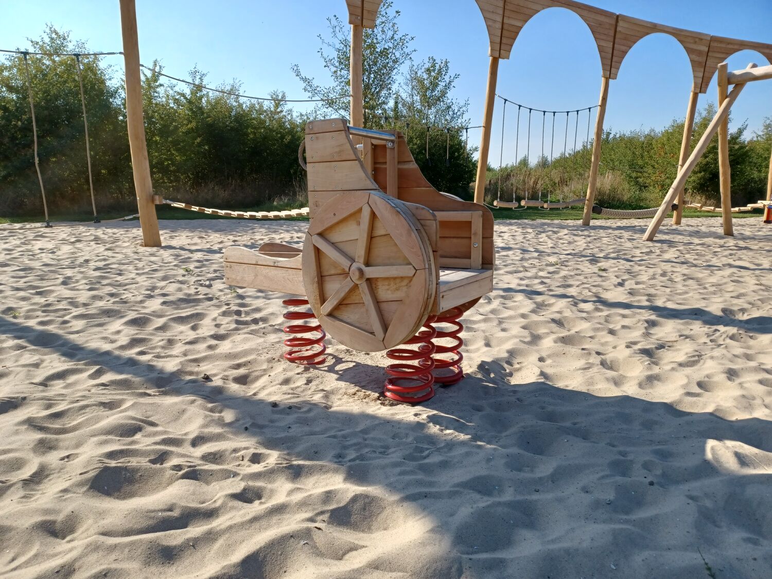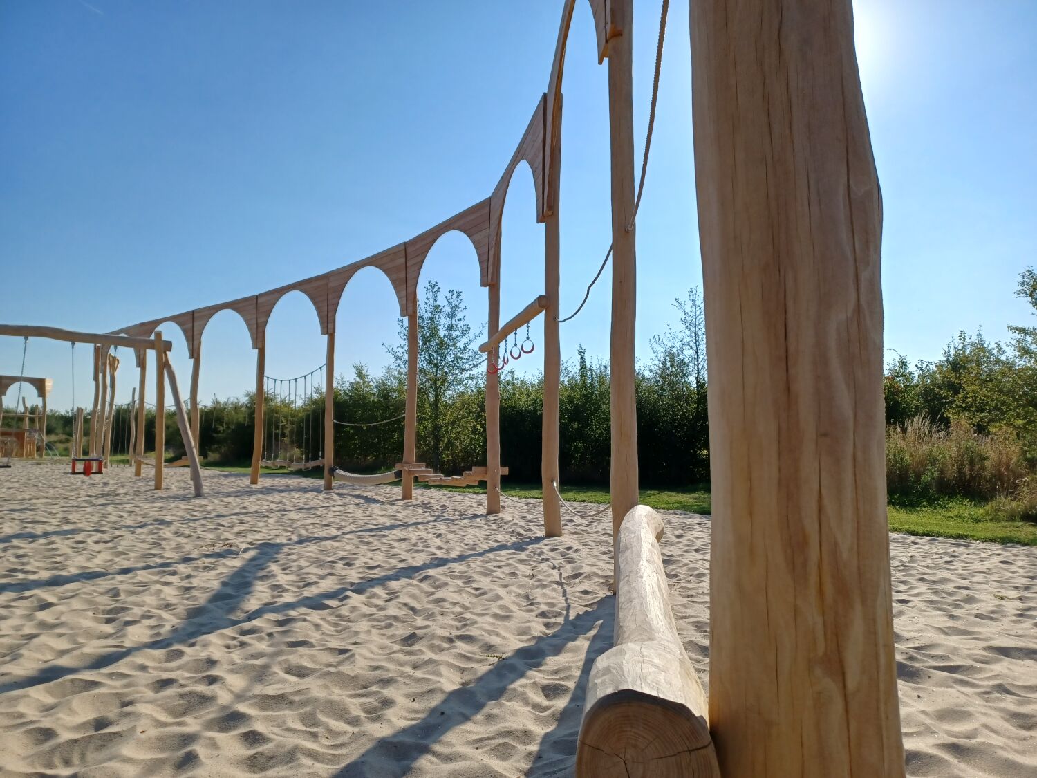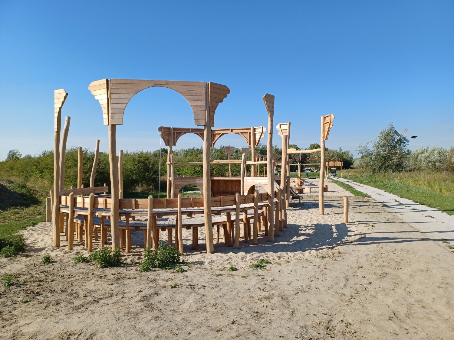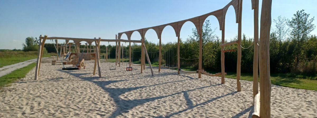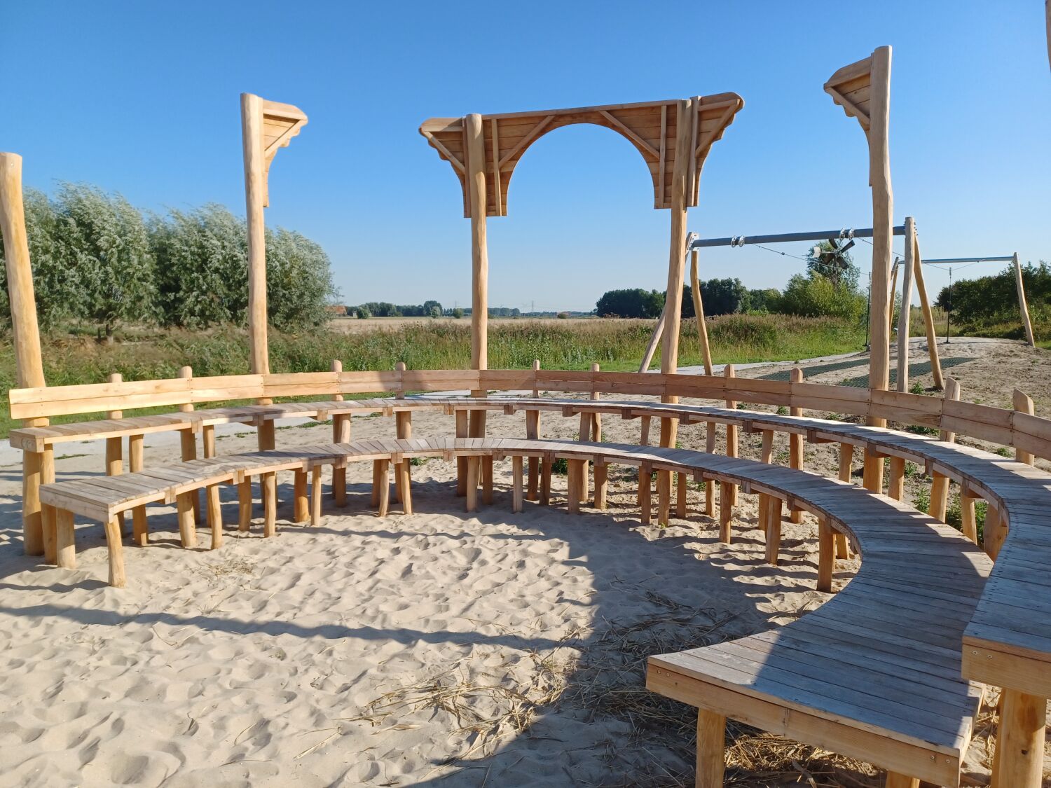Alle aanwezige speeltoestellen zijn gemaakt van Robinia. Dit natuurlijke, rauwe materiaal draagt extra bij aan het historische thema van de speelplek. Als ondergrond is er voor geel zand gekozen. Zo lijkt het echt alsof je in een Romeinse arena aan het strijden bent.