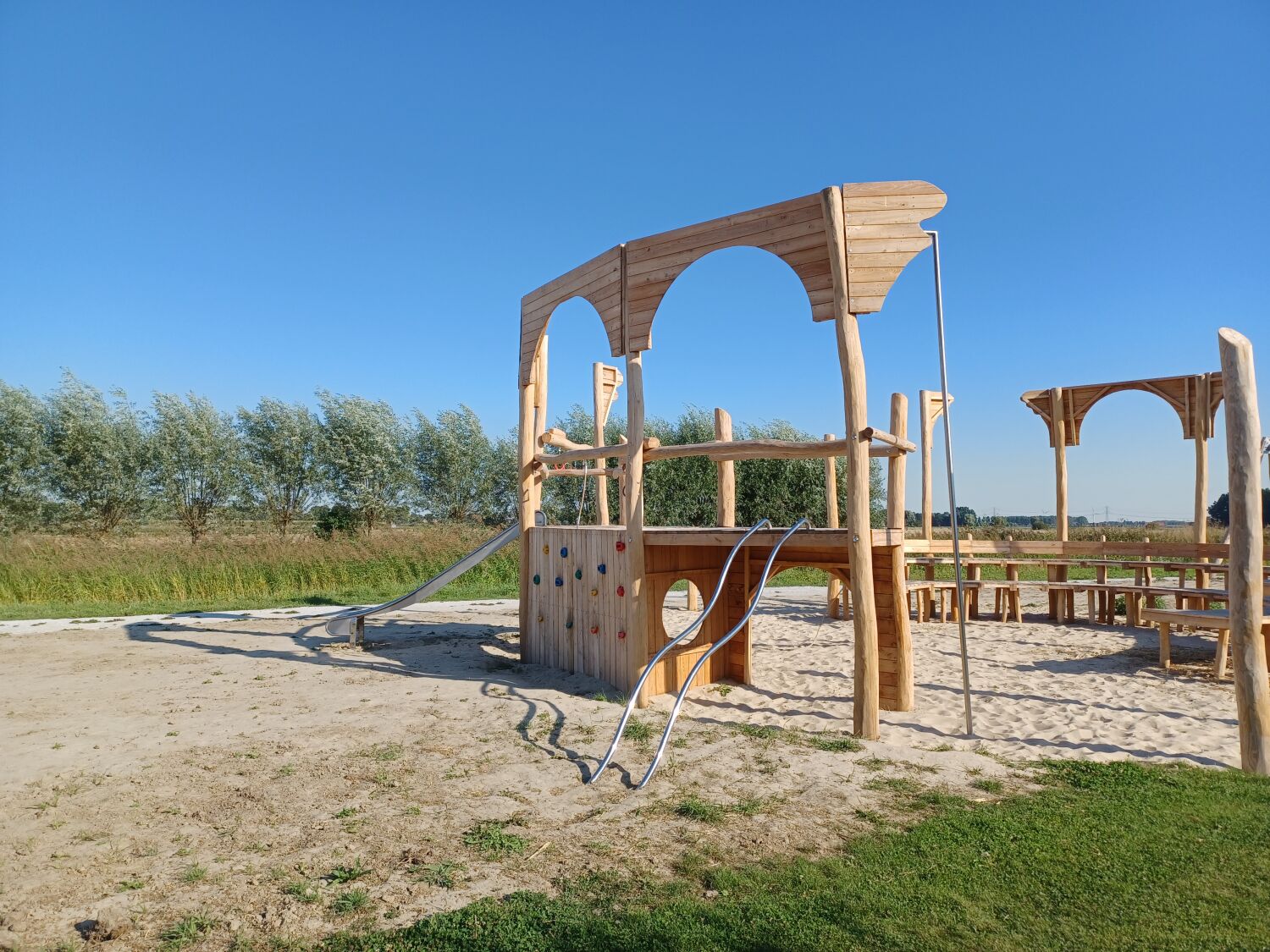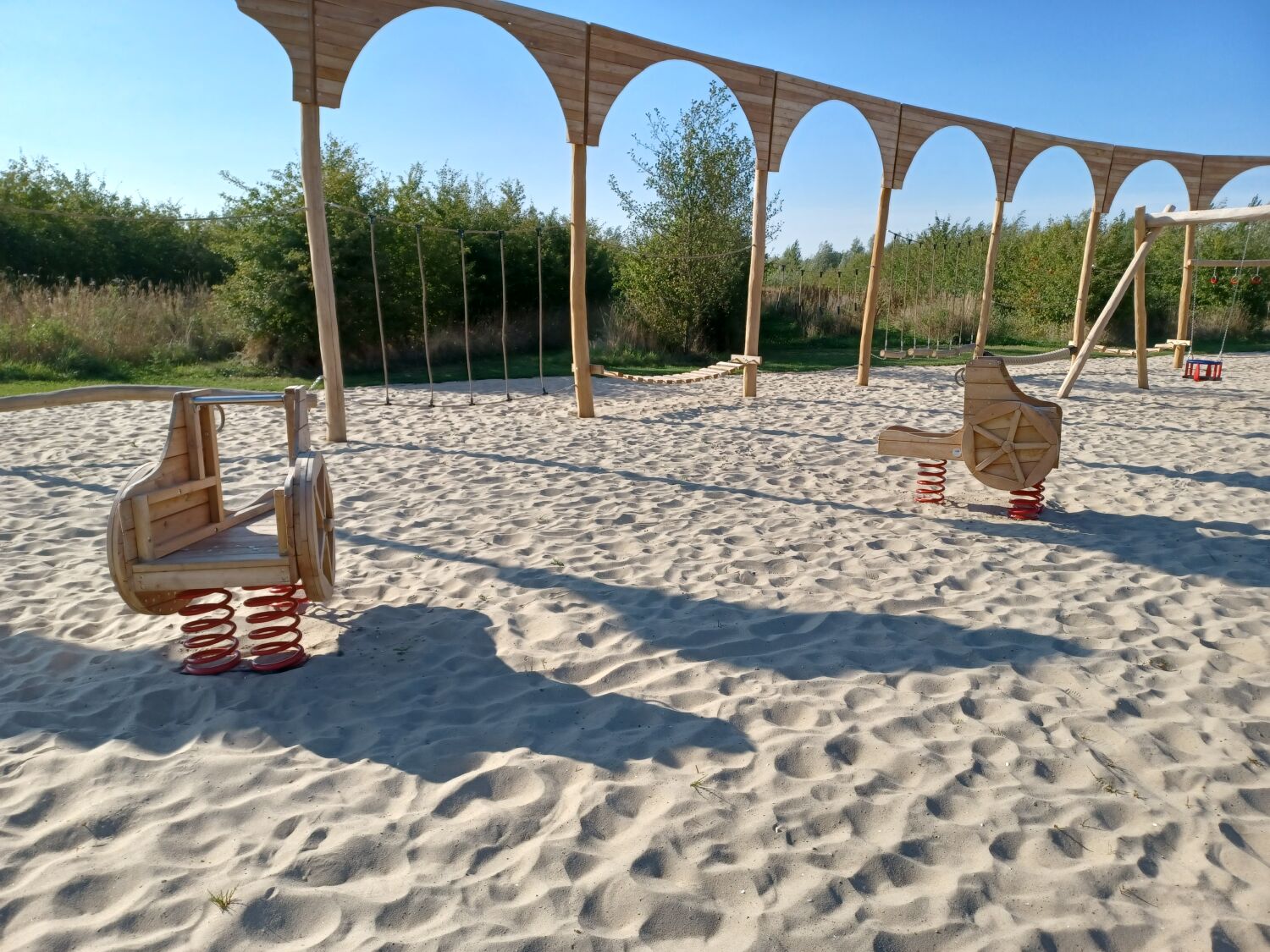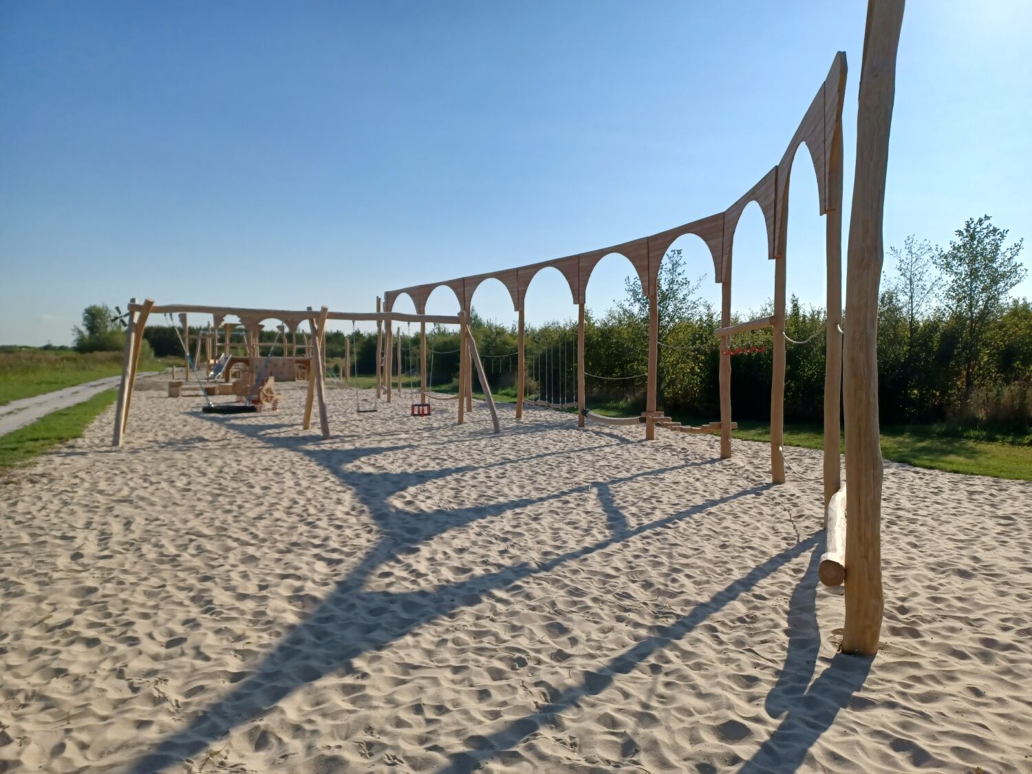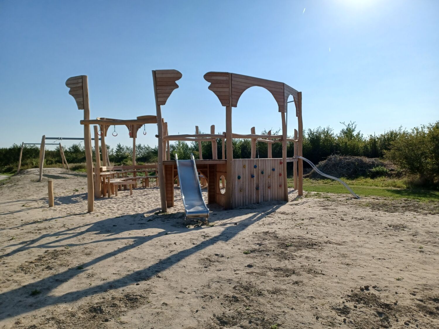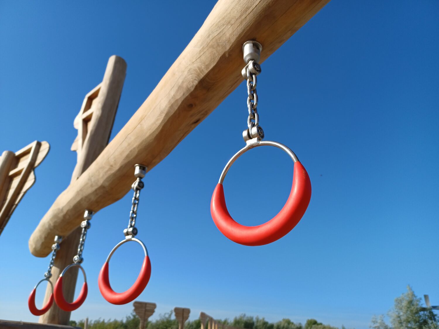 Alle aanwezige speeltoestellen zijn gemaakt van Robinia. Dit natuurlijke, rauwe materiaal draagt extra bij aan het historische thema van de speelplek. Als ondergrond is er voor geel zand gekozen. Zo lijkt het echt alsof je in een Romeinse arena aan het strijden bent.