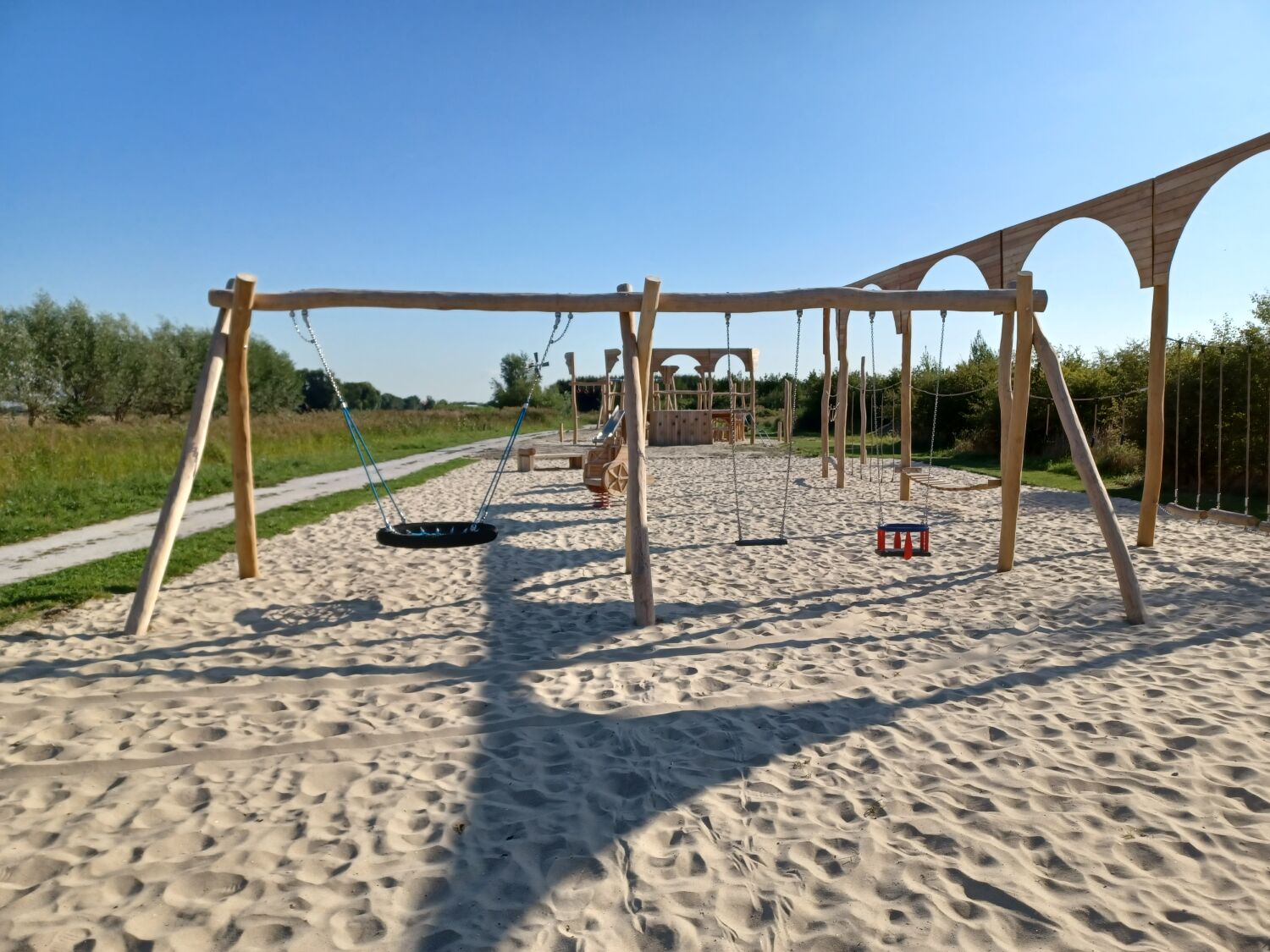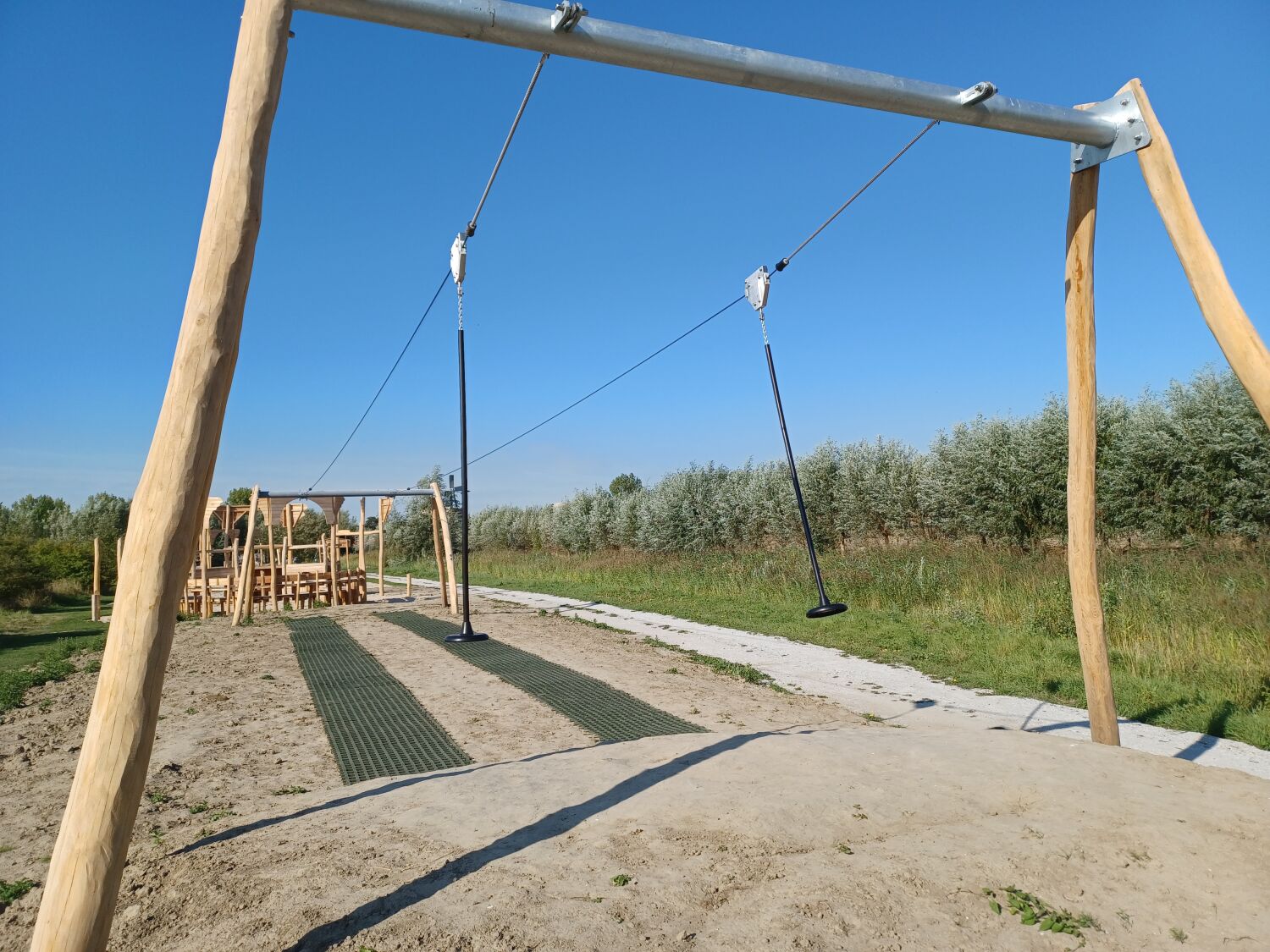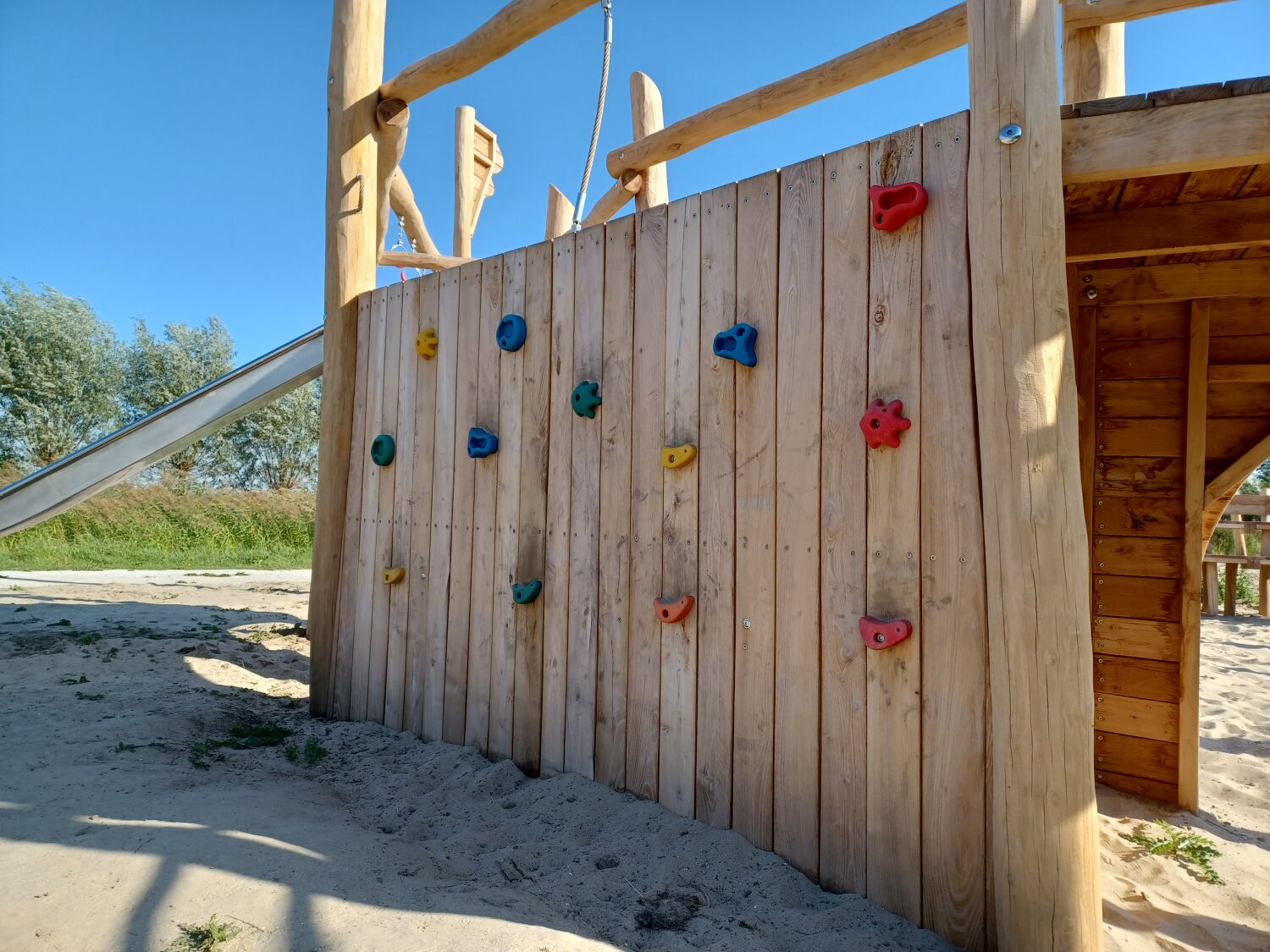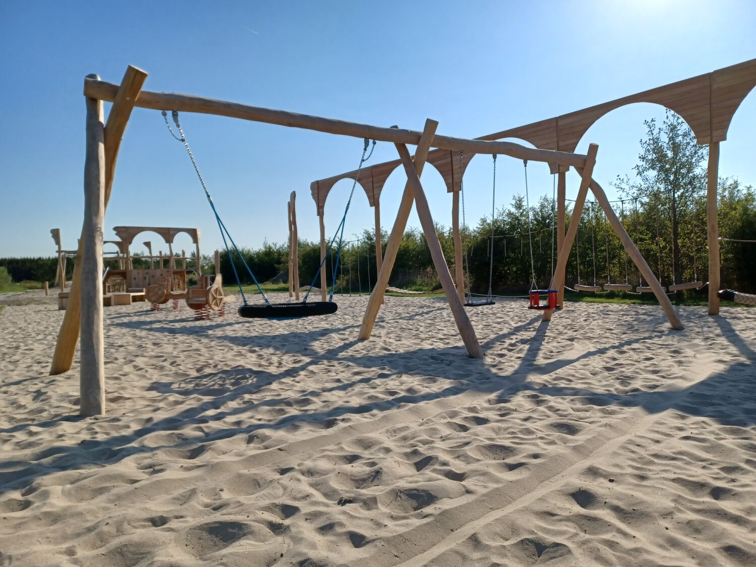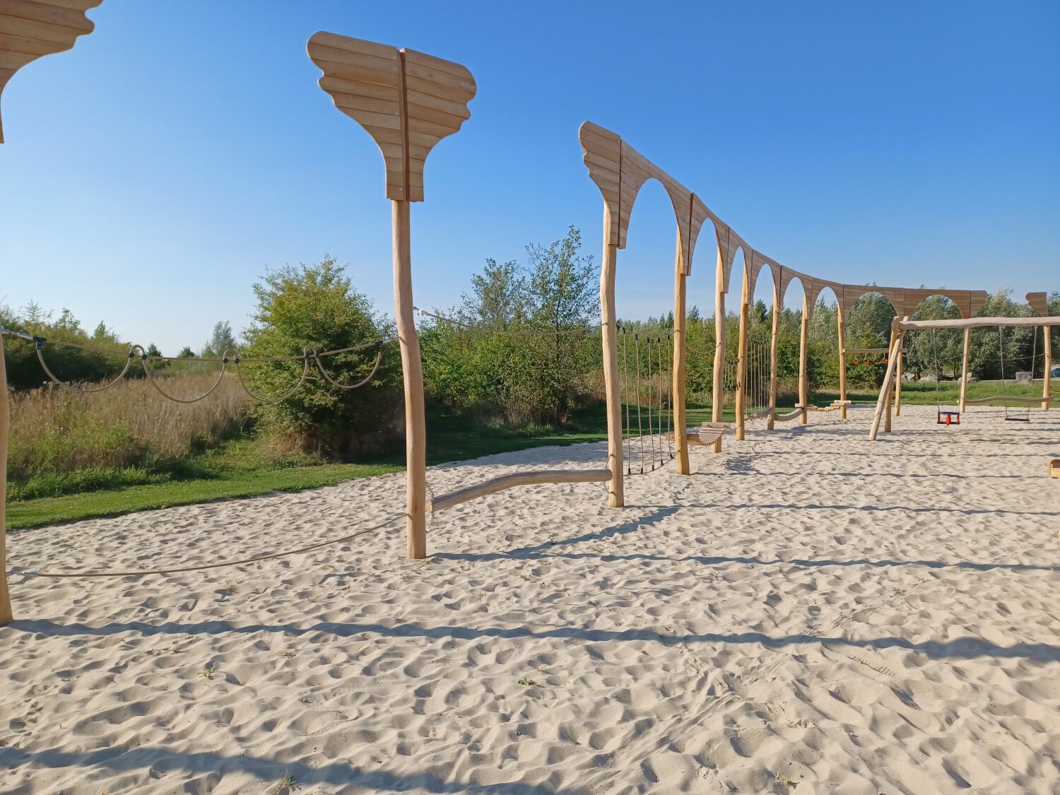 Alle aanwezige speeltoestellen zijn gemaakt van Robinia. Dit natuurlijke, rauwe materiaal draagt extra bij aan het historische thema van de speelplek. Als ondergrond is er voor geel zand gekozen. Zo lijkt het echt alsof je in een Romeinse arena aan het strijden bent.
