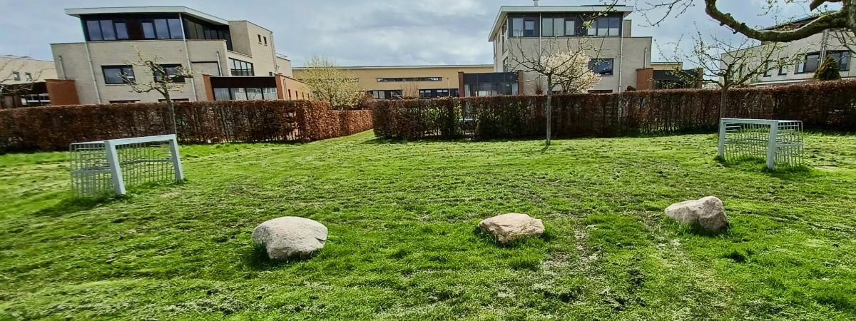 Bij de doeltjes hebben we ook direct een aantal zwerfkeien geplaatst. Deze kunnen gebruikte worden om op te zitten en naar de voetbalwedstrijd te kijken, of kunnen dienen als speelelementen waarbij je balans getraind kan worden. Multifuctioneel dus!