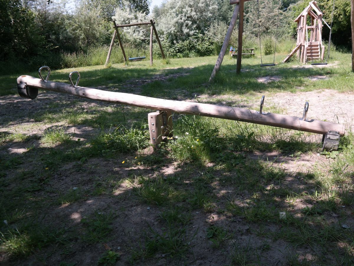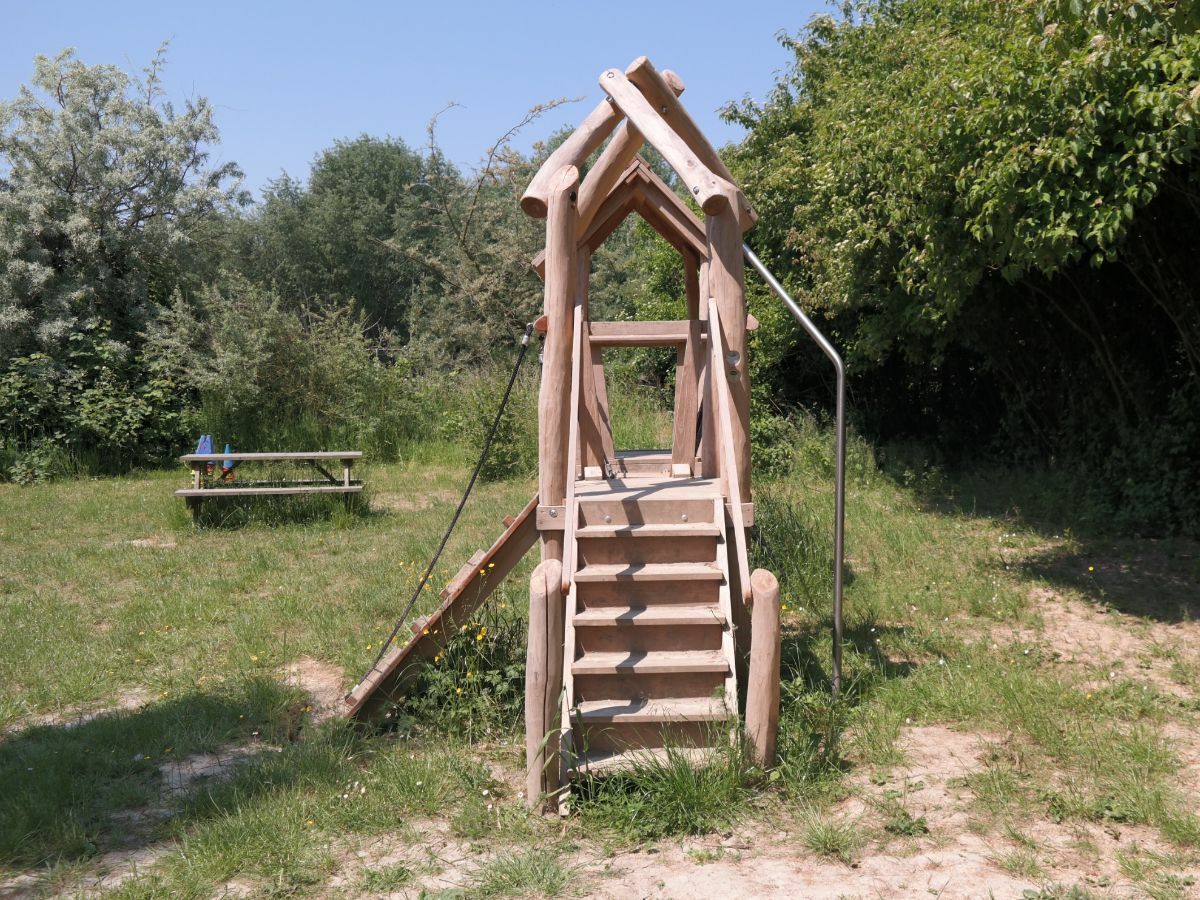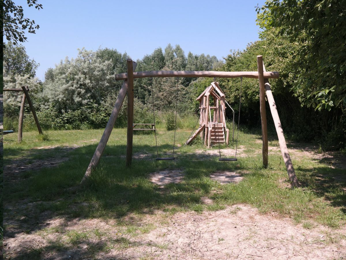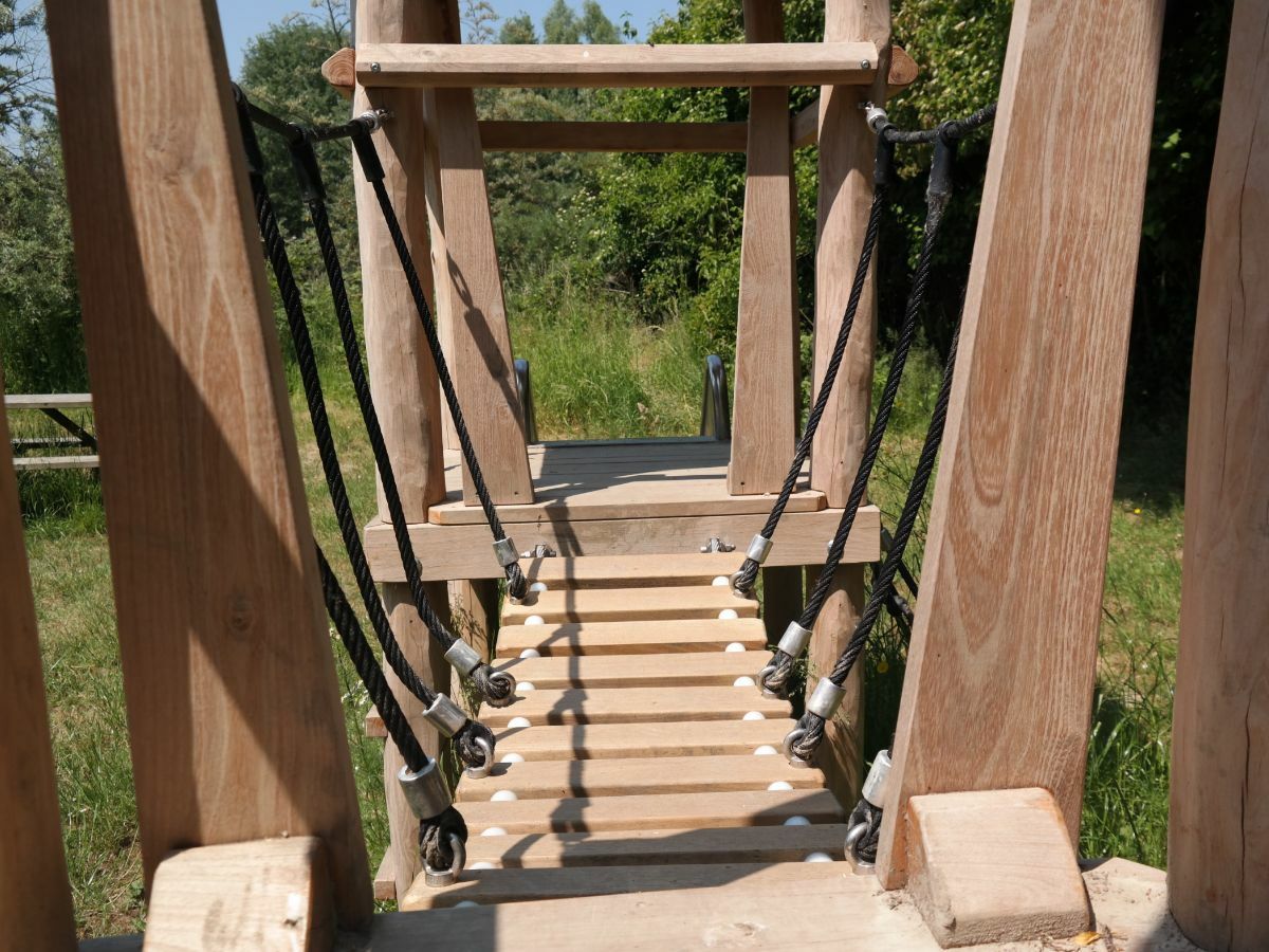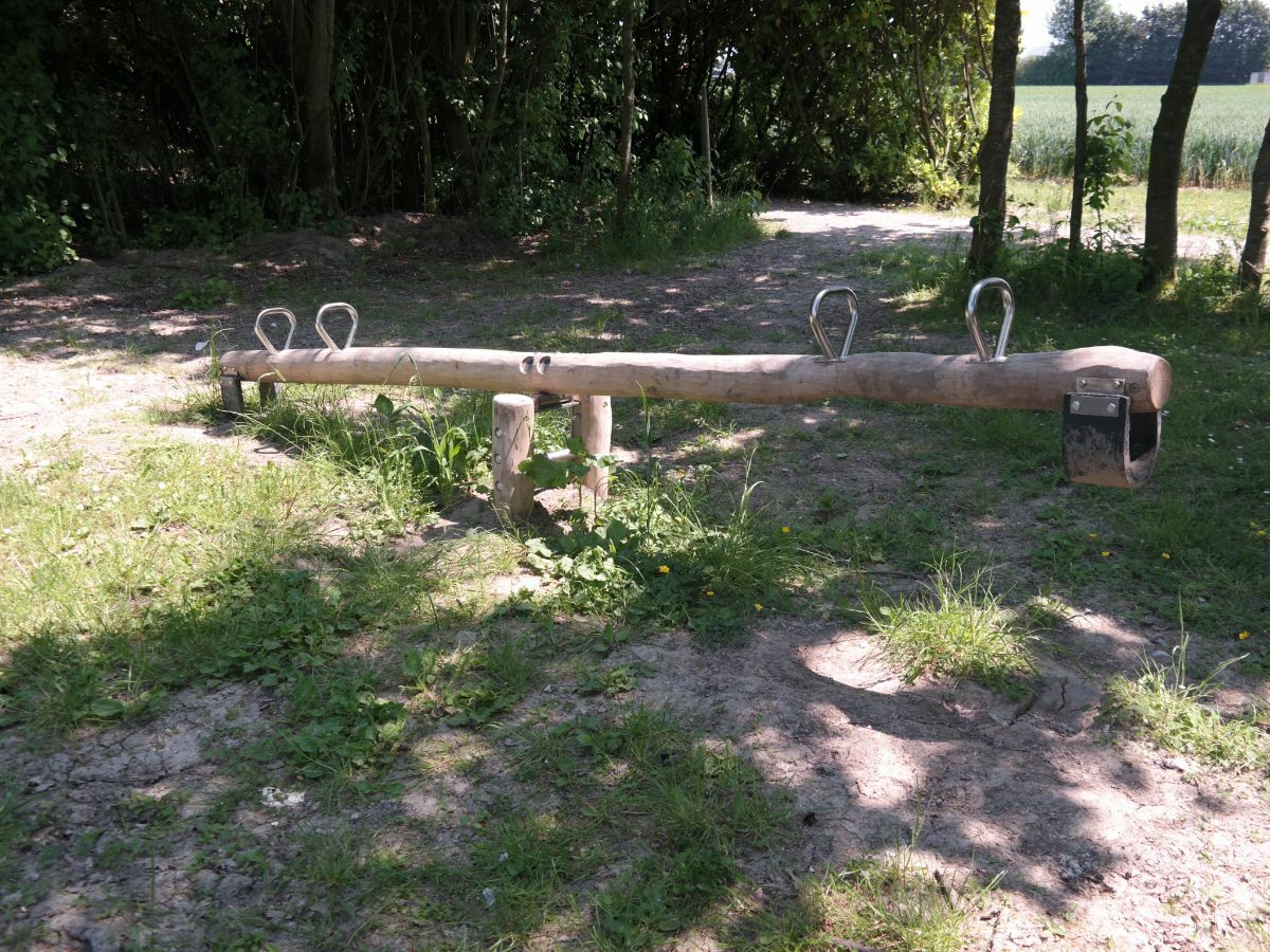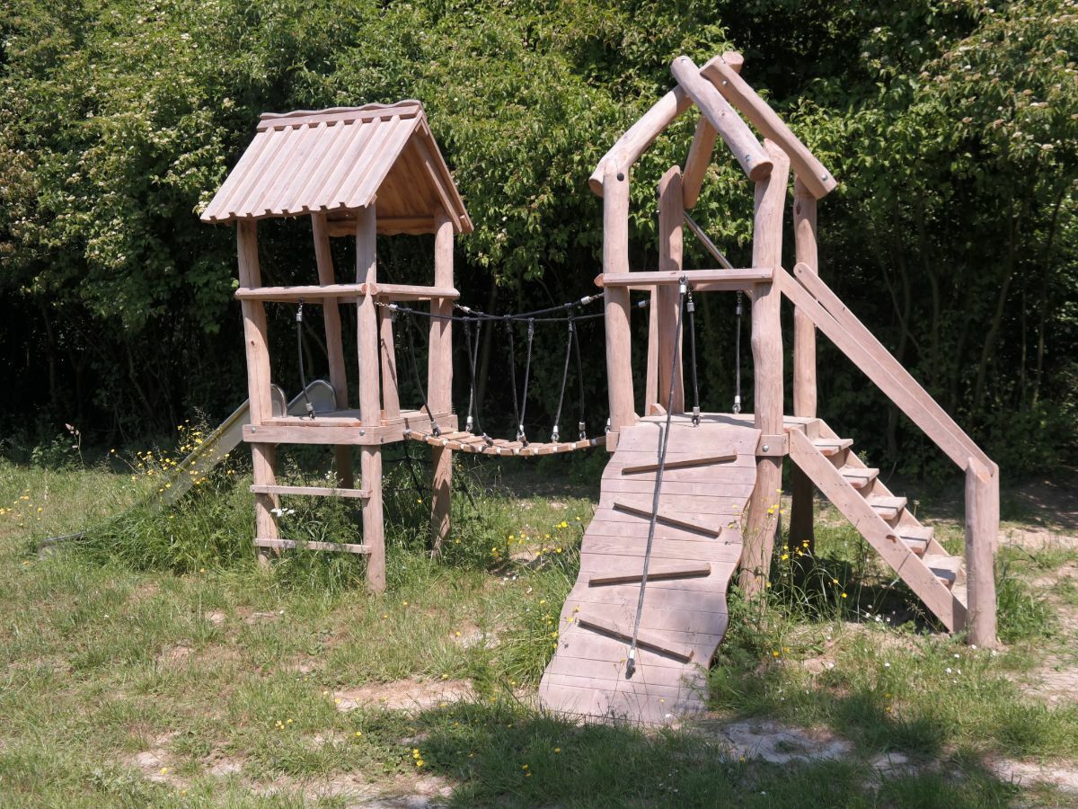 De vogelnestschommel die al aanwezig was verkeerde nog in goede staat, dus die hebben we fijn laten staan. We hebben daar voor de uitdaging een dubbele schommel, Speelcombinatie Libelle en een 4-zitswip aan toegevoegd. Al deze speeltoestellen zijn gemaakt van Robinia hout. Deze materiaalsoort sluit het beste aan bij de groene omgeving waarin de Hosvazze zich bevindt.