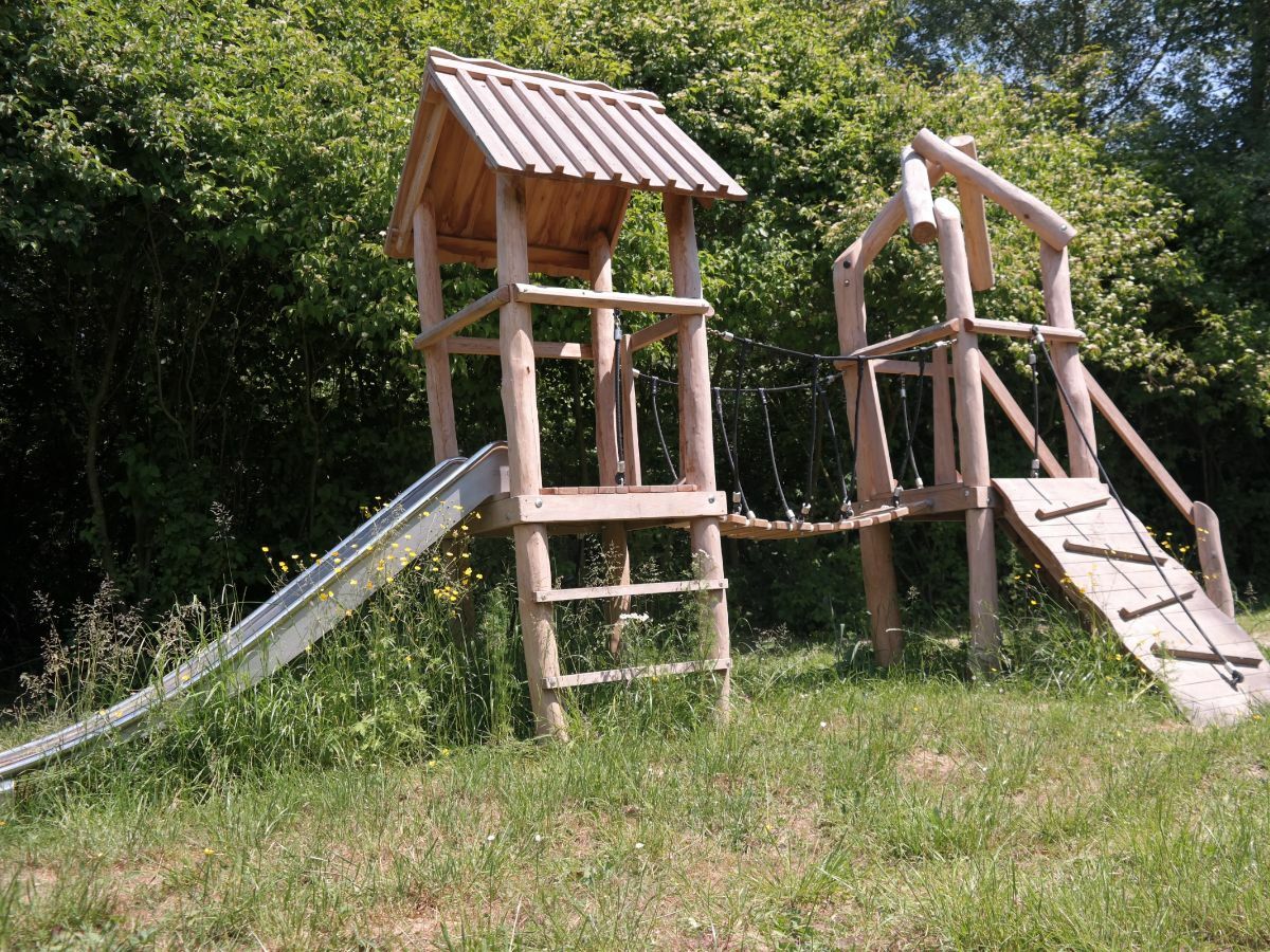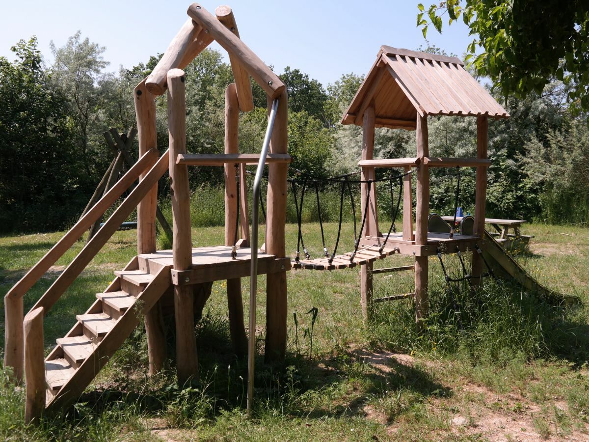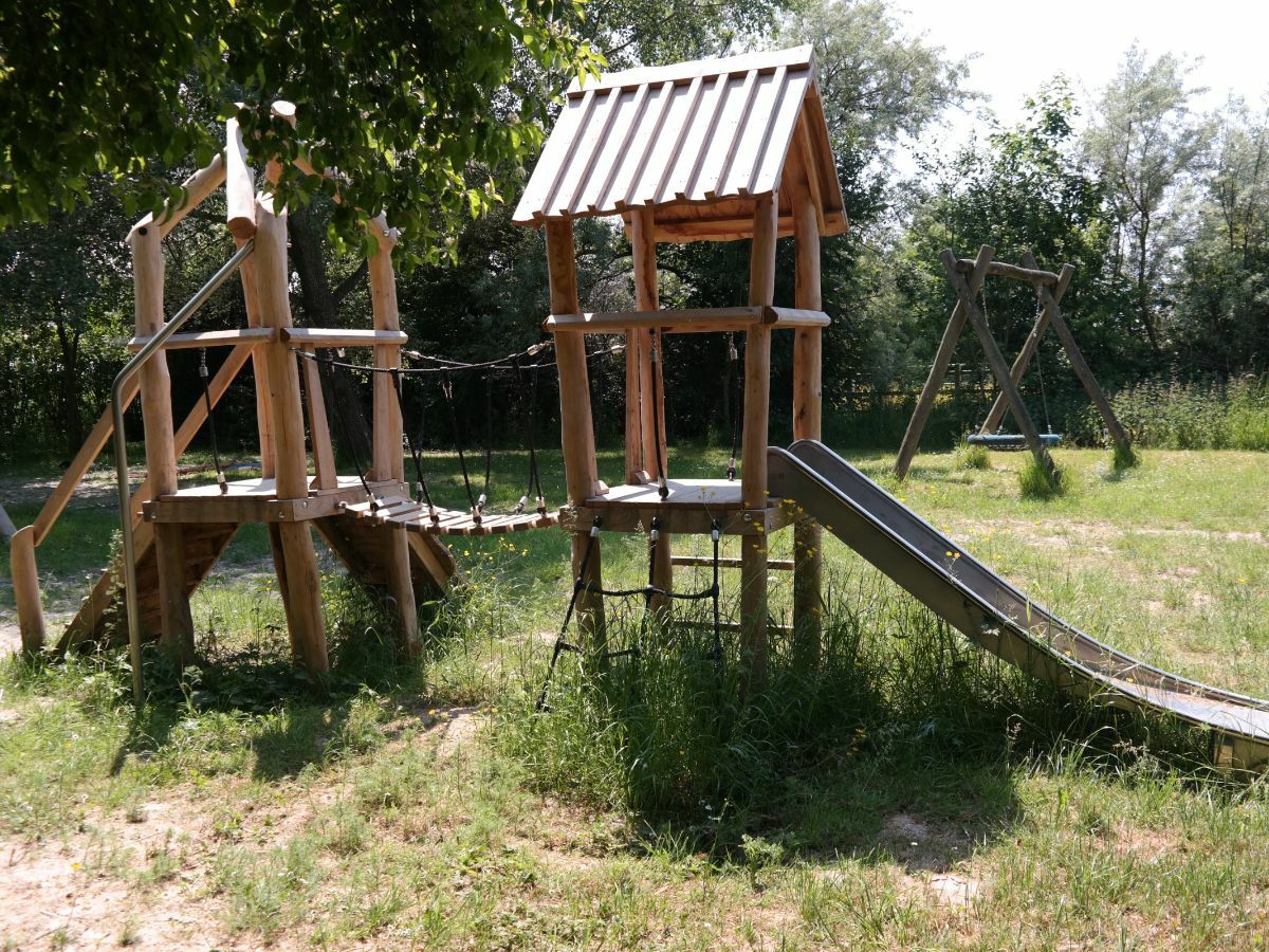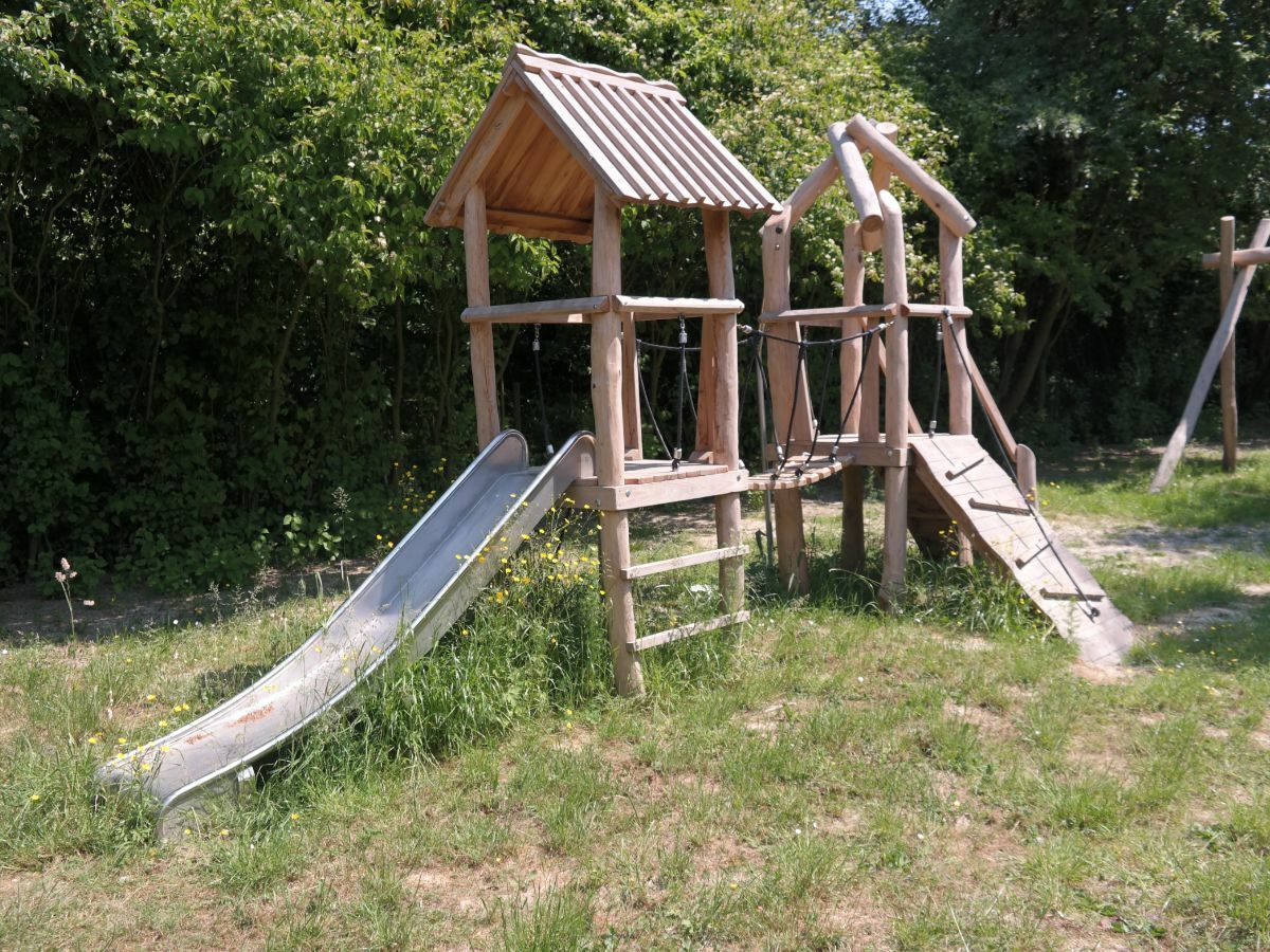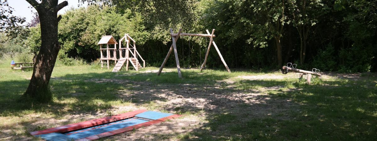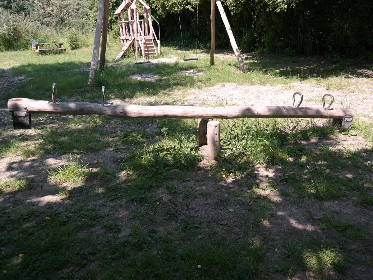 De vogelnestschommel die al aanwezig was verkeerde nog in goede staat, dus die hebben we fijn laten staan. We hebben daar voor de uitdaging een dubbele schommel, Speelcombinatie Libelle en een 4-zitswip aan toegevoegd. Al deze speeltoestellen zijn gemaakt van Robinia hout. Deze materiaalsoort sluit het beste aan bij de groene omgeving waarin de Hosvazze zich bevindt.