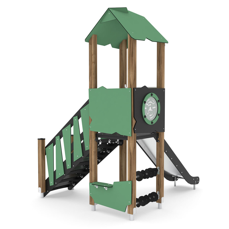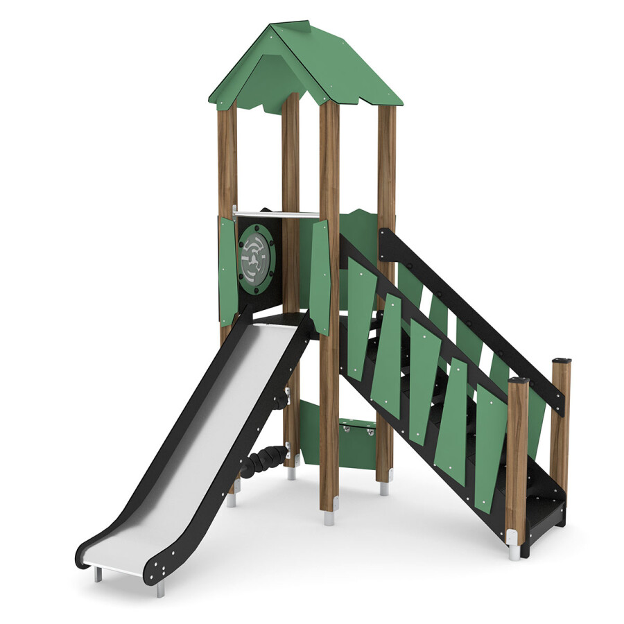 Dit speeltoestel is standaard uitgevoerd met een plywood vloer. Ben je op zoek naar nóg duurzamer speelplezier? Dit speeltoestel is optioneel ook verkrijgbaar met een HPL-vloer. Informeer naar de mogelijkheden.