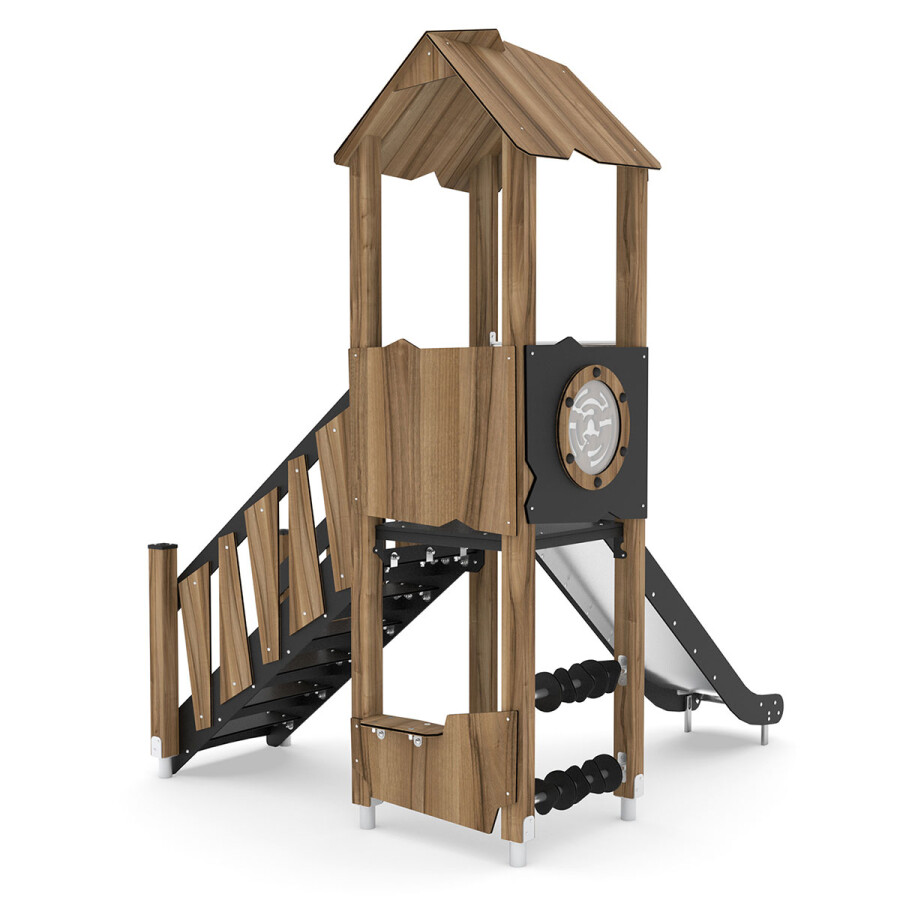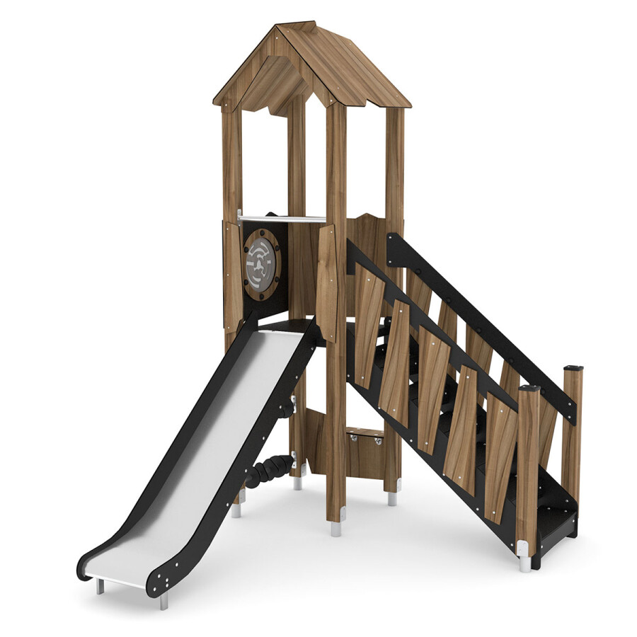 Dit speeltoestel is standaard uitgevoerd met een plywood vloer. Ben je op zoek naar nóg duurzamer speelplezier? Dit speeltoestel is optioneel ook verkrijgbaar met een HPL-vloer. Informeer naar de mogelijkheden.