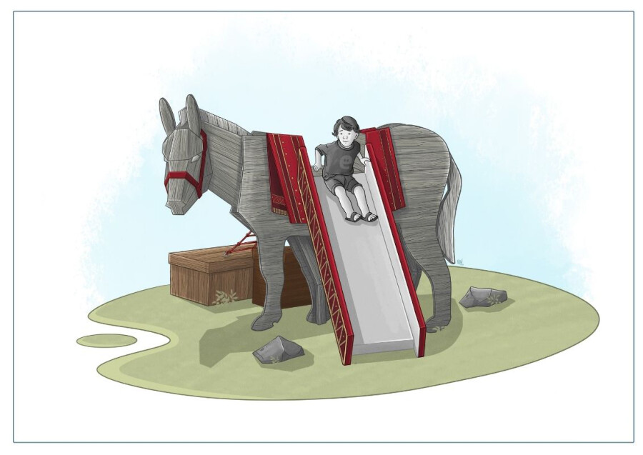 Ia, ezeltje strekje. Klauter op de ezel en ga op avontuur.