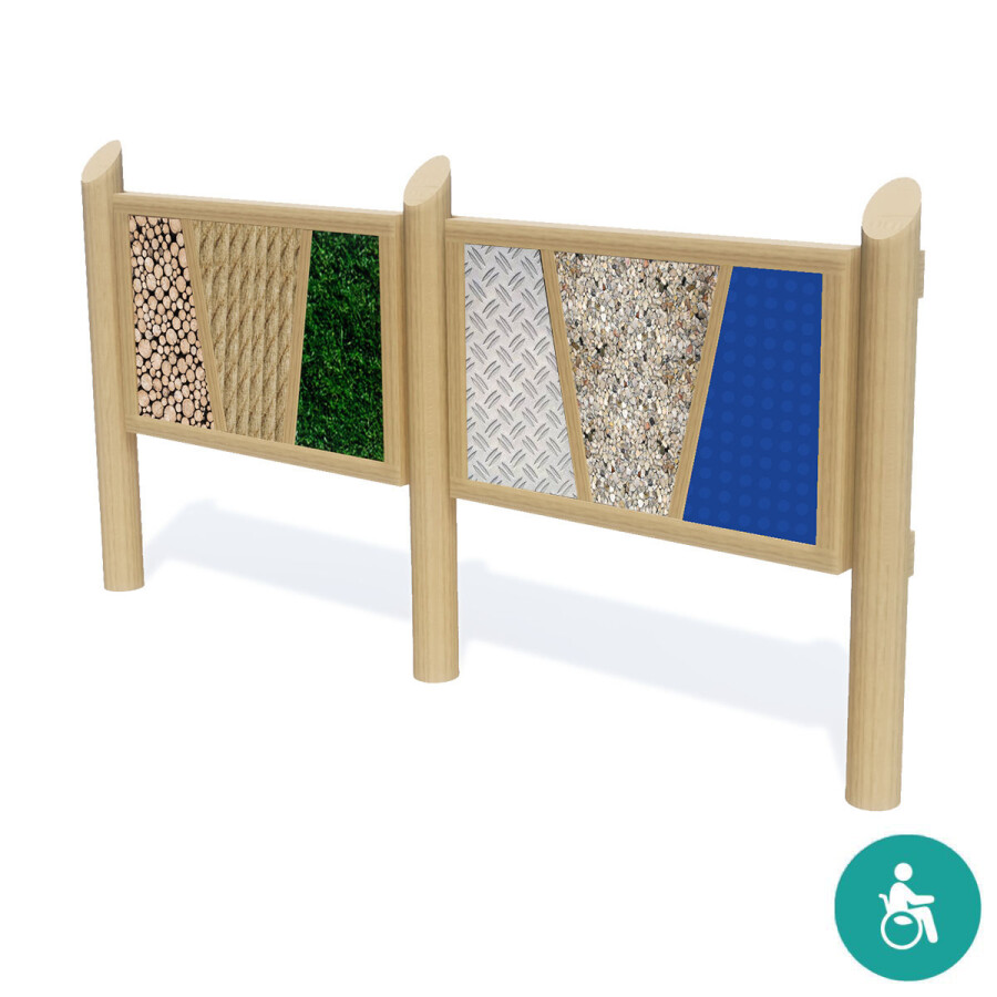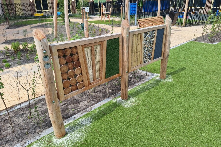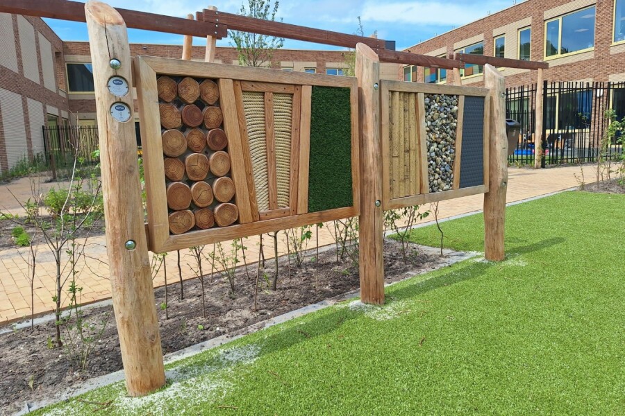 3 van de vakken van de voelwand bestaan uit restmateriaal, deze kunnen ten alle tijden gewijzigd worden t.o.v. de vertoonde afbeelding.
