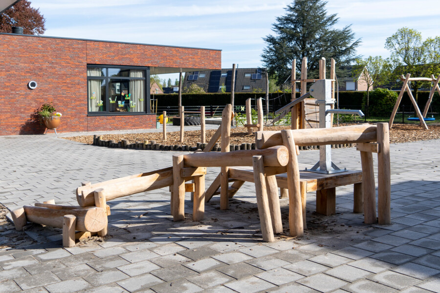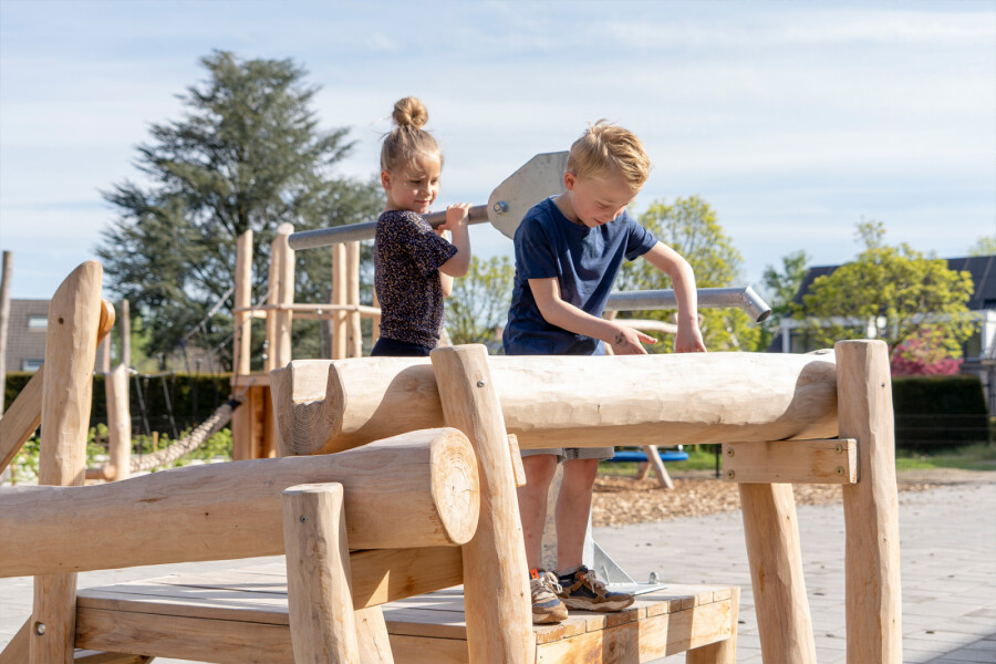 Samenspel wordt bij waterspeeltoestellen extra gestimuleerd, de een pompt het water omhoog, de ander zorgt bijv. voor de dammen.