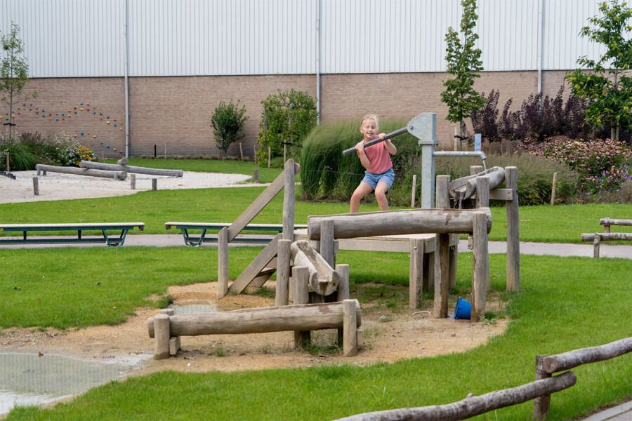 Spetteren, moddertaartjes bakken, dammen graven, een waterspeeltoestel biedt eindeloos veel speelmogelijkheden.